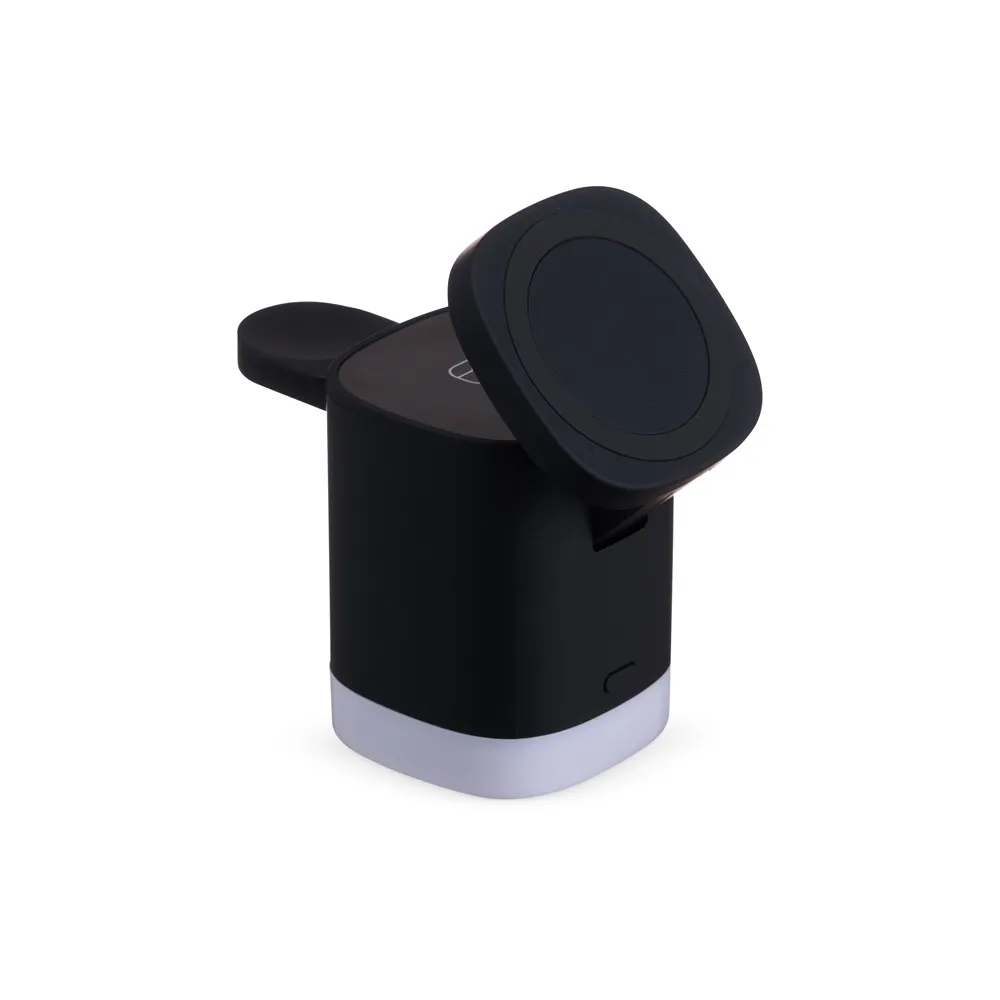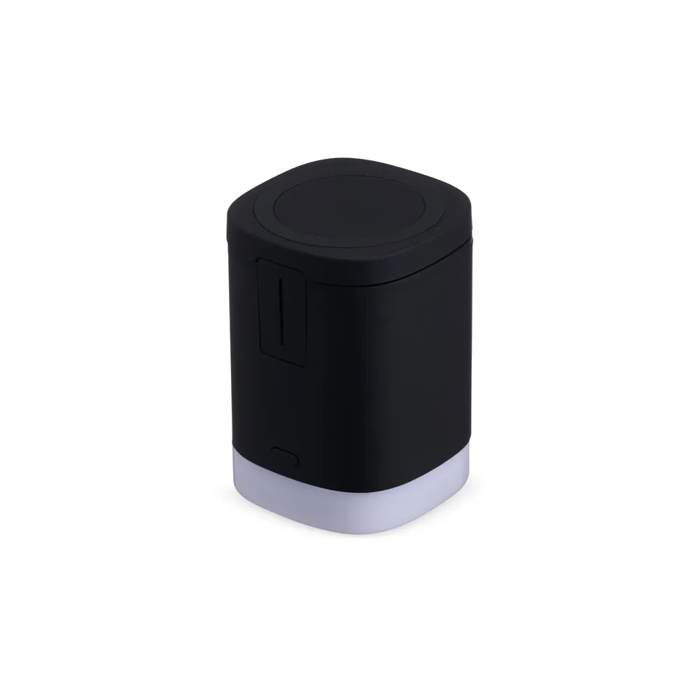 Carregador 3 em 1? A nossa base de carregamento é diferenciada, já que possui indução para relógio, fones e celular, e você pode usá-los todos ao mesmo tempo, basta que o celular e demais dispositivos tenham a tecnologia QI. O LED RGB possui 2 modos, luz branca e vermelho, verde e azul se alternando. Feita em plástico, a base não armazena energia, portanto, precisa estar conectada ao cabo tipo-C que a acompanha.