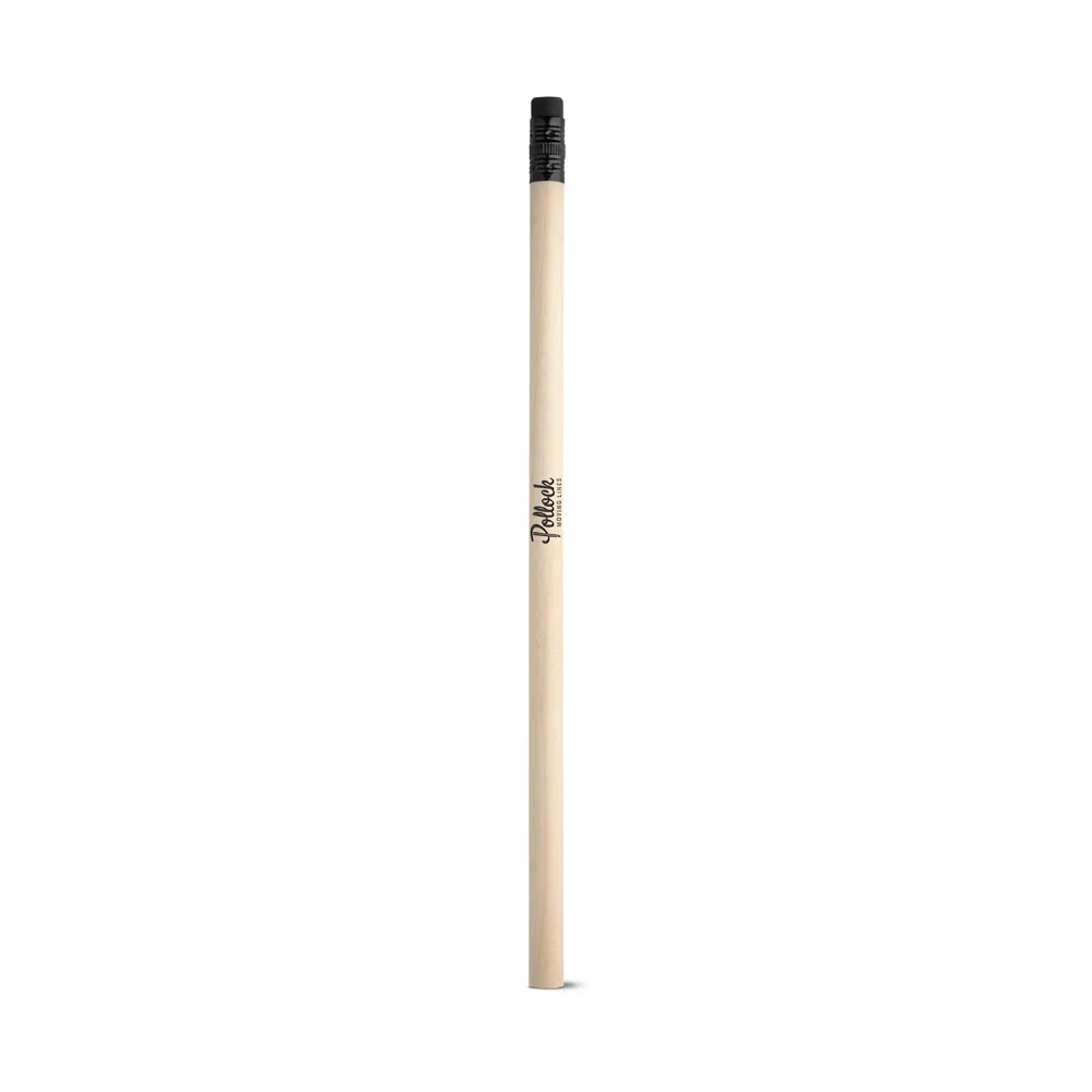 Lápis em madeira natural com borracha no topo. Grau de dureza: HB. Produto certificado de acordo com a portaria Inmetro nº423 de 8/out/2021. A cor e o resultado da impressão nos materiais naturais pode variar entre produtos. ø7 x 190 mm