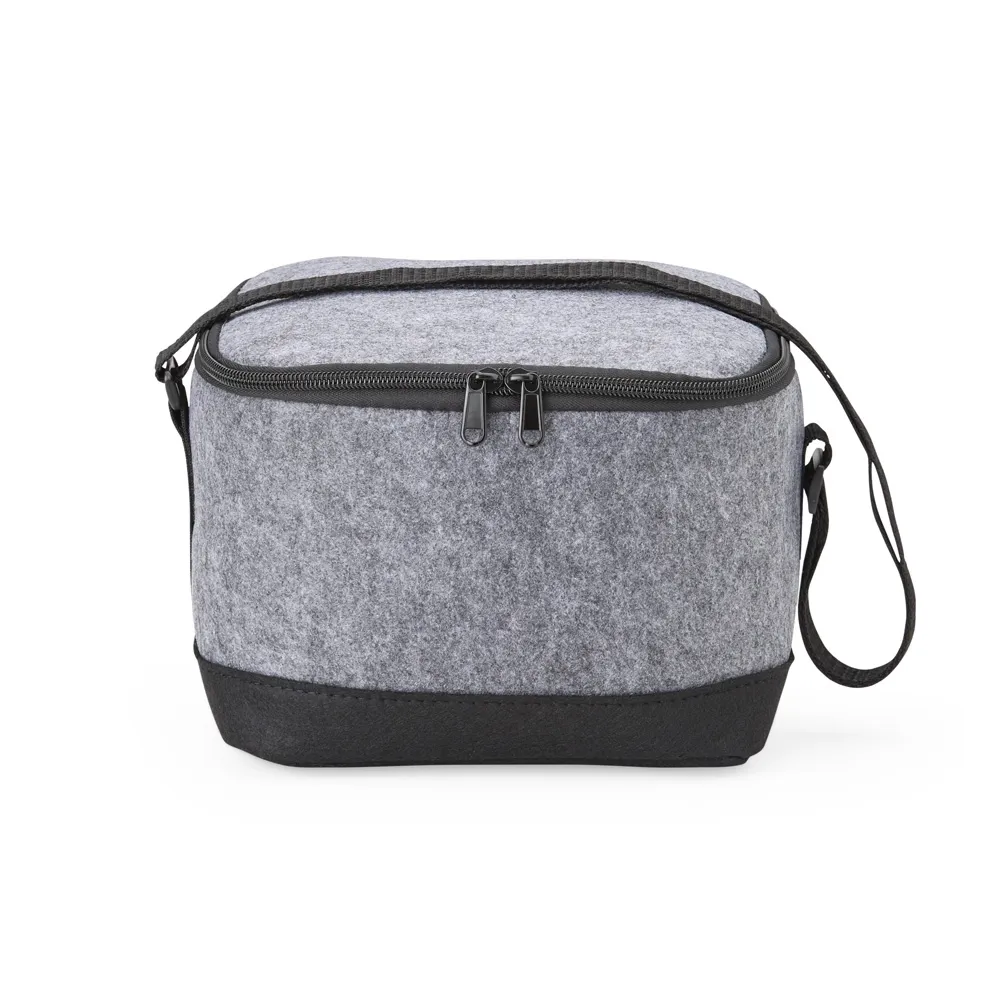 Bolsa térmica em tecido feltro com capacidade para 6 litros, possui revestimento térmico e acompanha alça transversal.