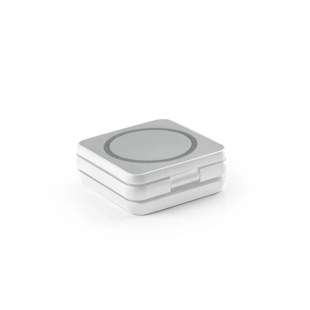 Carregador magnético por indução (wireless) super-rápido dobrável em ABS 100% reciclado, que permitem carregar três dispositivos simultaneamente: celular 15W, fones de ouvido 5W e smartwatch 2.5W, com tecnologia de carregamento sem fios. Incluso um grip magnético extra para ser colocado nos smartphones que não tenham e um cabo de carregamento rápido USB-C. Ideal para usar no escritório e levar em viagem. O produto também pode ser utilizado como suporte. Fornecido em caixa presente de papel kraft reciclado. Dobrado: 70 x 70 x 25 mm | Caixa: 110 x 90 x 36 mm