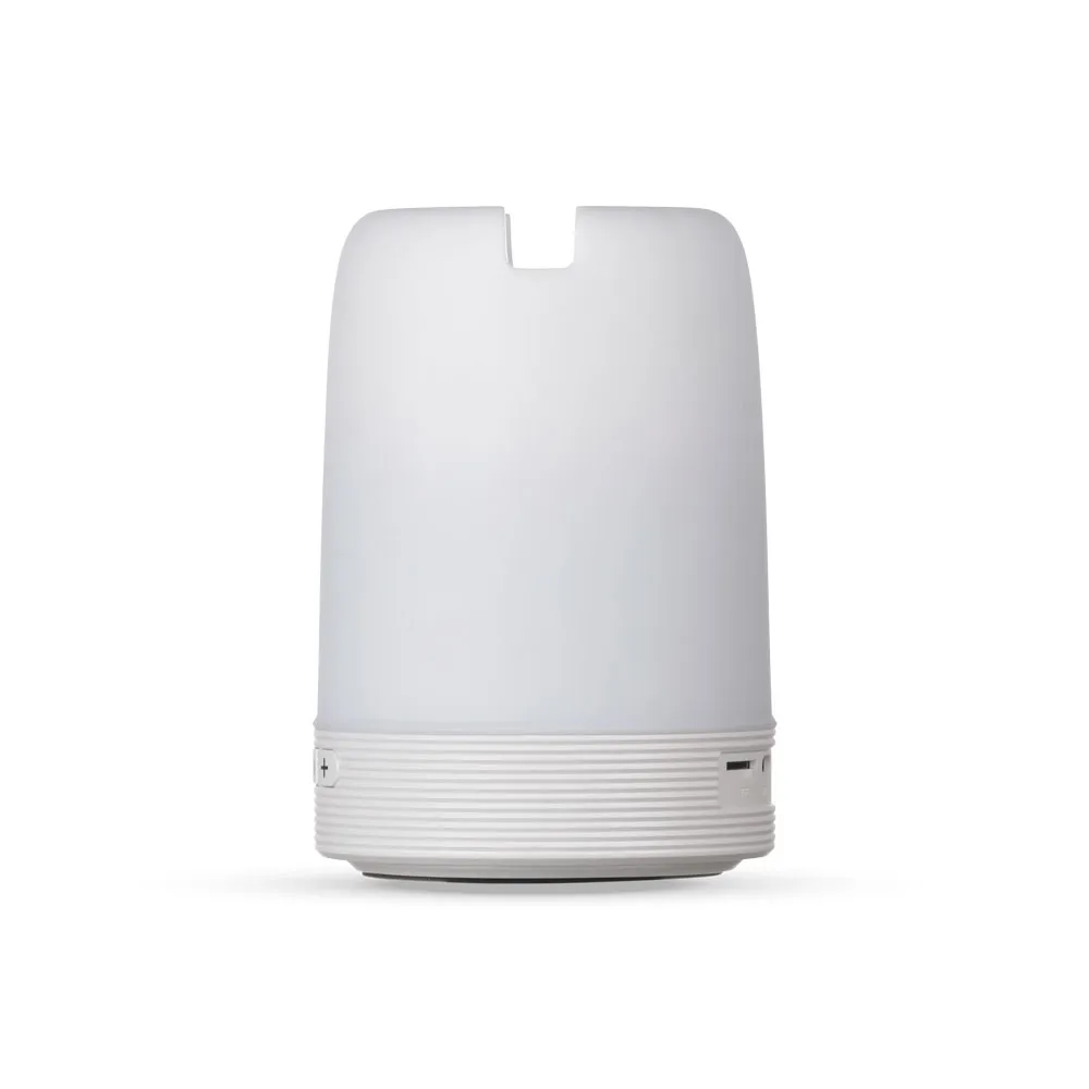 Caixa de som multimídia com luzes, suporte para celular e porta caneta. Material plástico resistente na cor branca fosca, parte superior com falante vazado na área interna, pode ser utilizado como porta caneta ou suporte para celular. Parte inferior branca leitosa com linhas em relevo, borracha inferior anti deslizante e alça de alumínio.