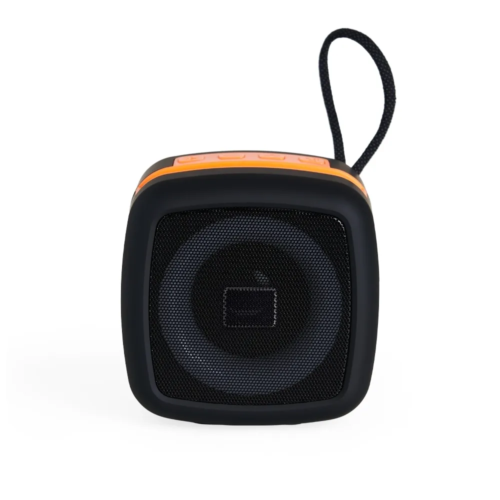 Caixa de som multimídia em plástico com espaço superior para encaixe do celular e base com revestimento antiderrapante. Oferece conectividade Bluetooth e entrada auxiliar P2, além de cartão TF (microSD) e USB-C, permitindo a reprodução de arquivos MP3. Acompanha cordão de nylon e cabo USB-C para carregamento.