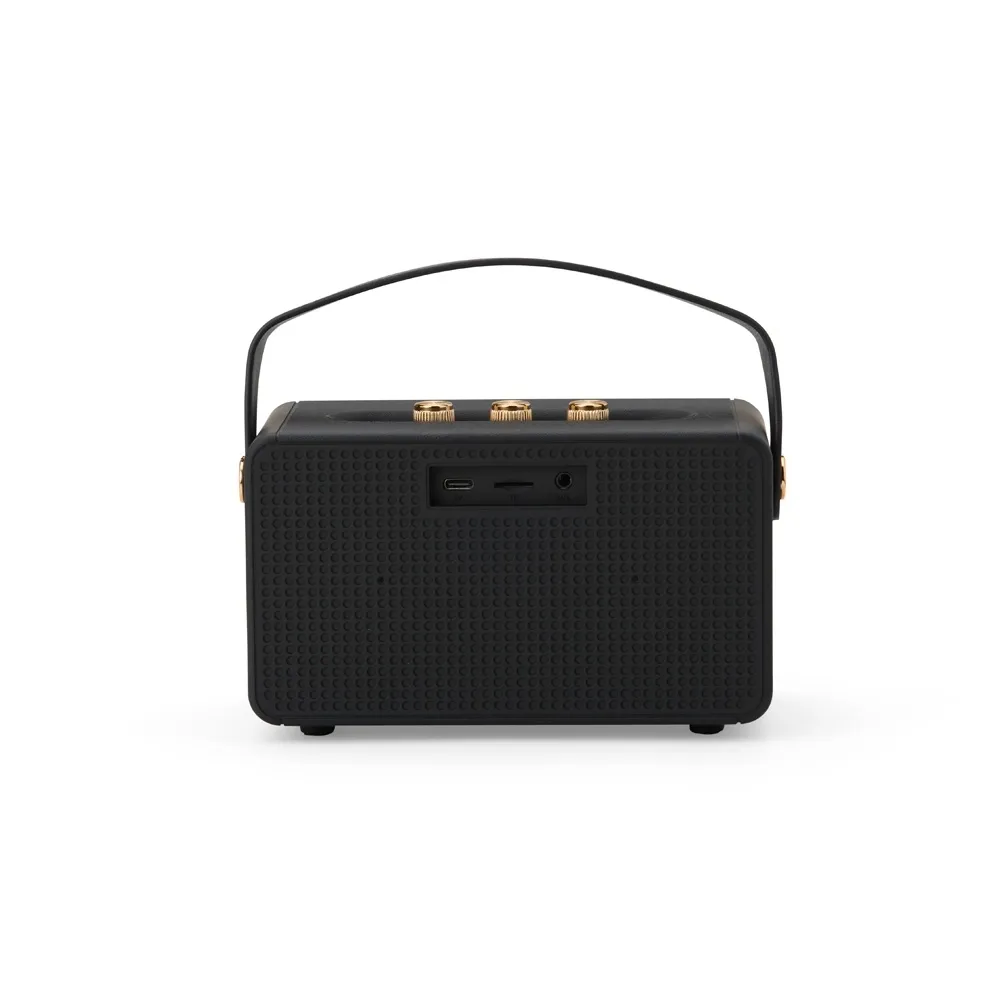 Caixa de som multimídia com design inspirado em amplificadores de guitarra. Possui construção em plástico ABS e metal, classificação IPX4 resistente a respingos d’água, painel superior de botões para controle, alça em couro sintético para transporte e pés com revestimento emborrachado. Oferece conectividade Bluetooth 5.1 e entrada para cabo auxiliar P2, além de cartão TF (MicroSD) e USB-A, permitindo a reprodução de arquivos MP3. Acompanha cabo USB-C para carregamento.