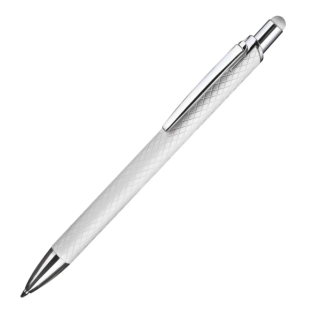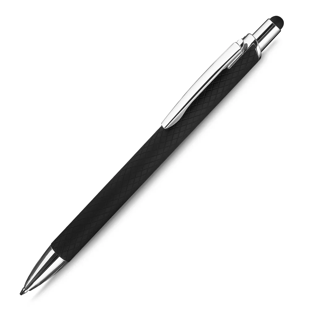 Caneta esferográfica em alumínio reciclavel com escrita em azul. Refil tipo parker e ponta touch emborrachada.\r\n\r\n*apresenta símbolo de reciclável na parte traseira da caneta.