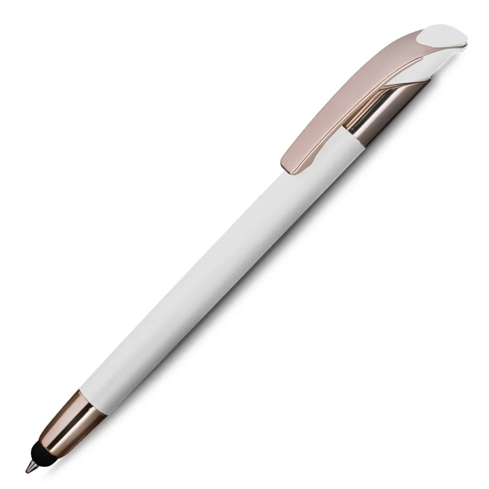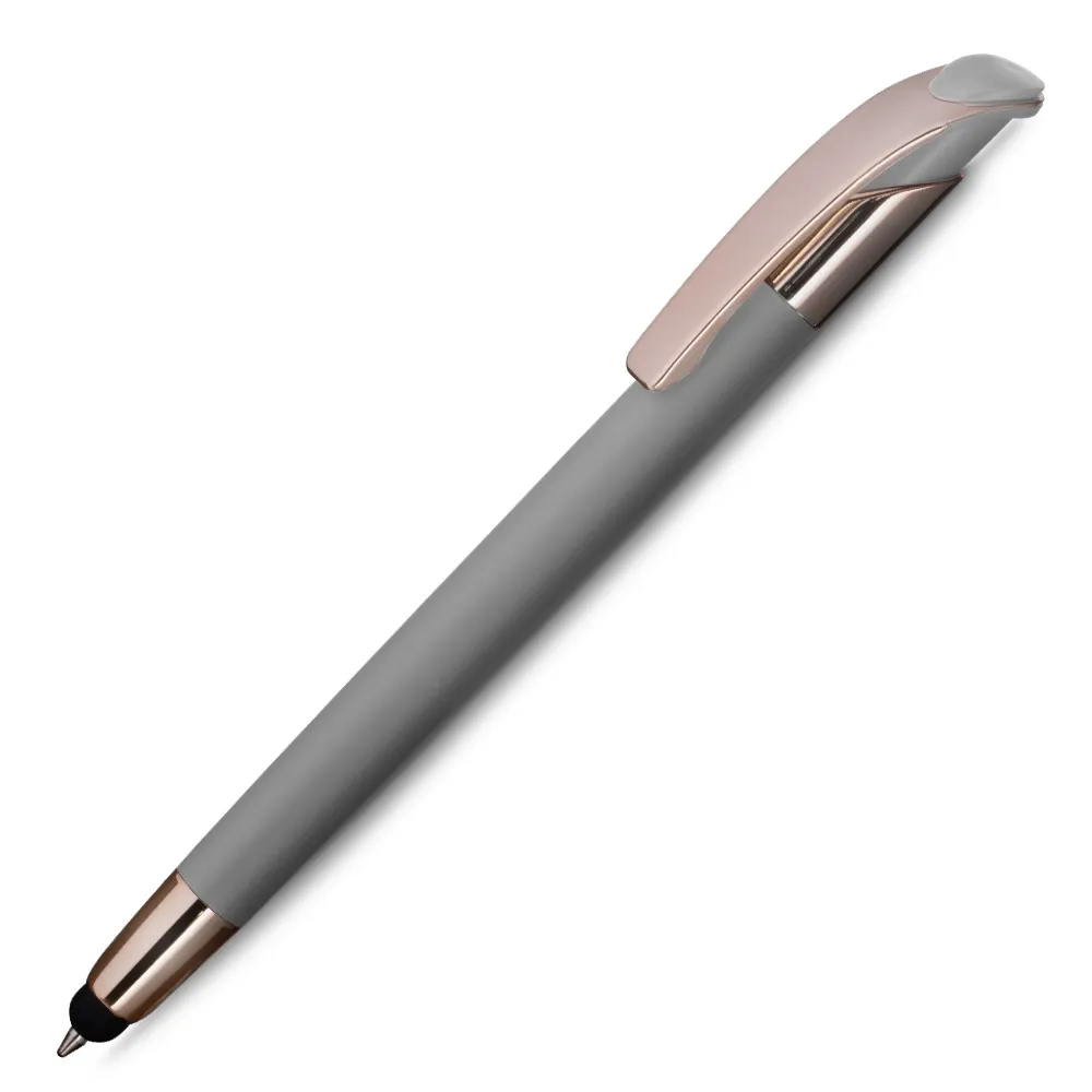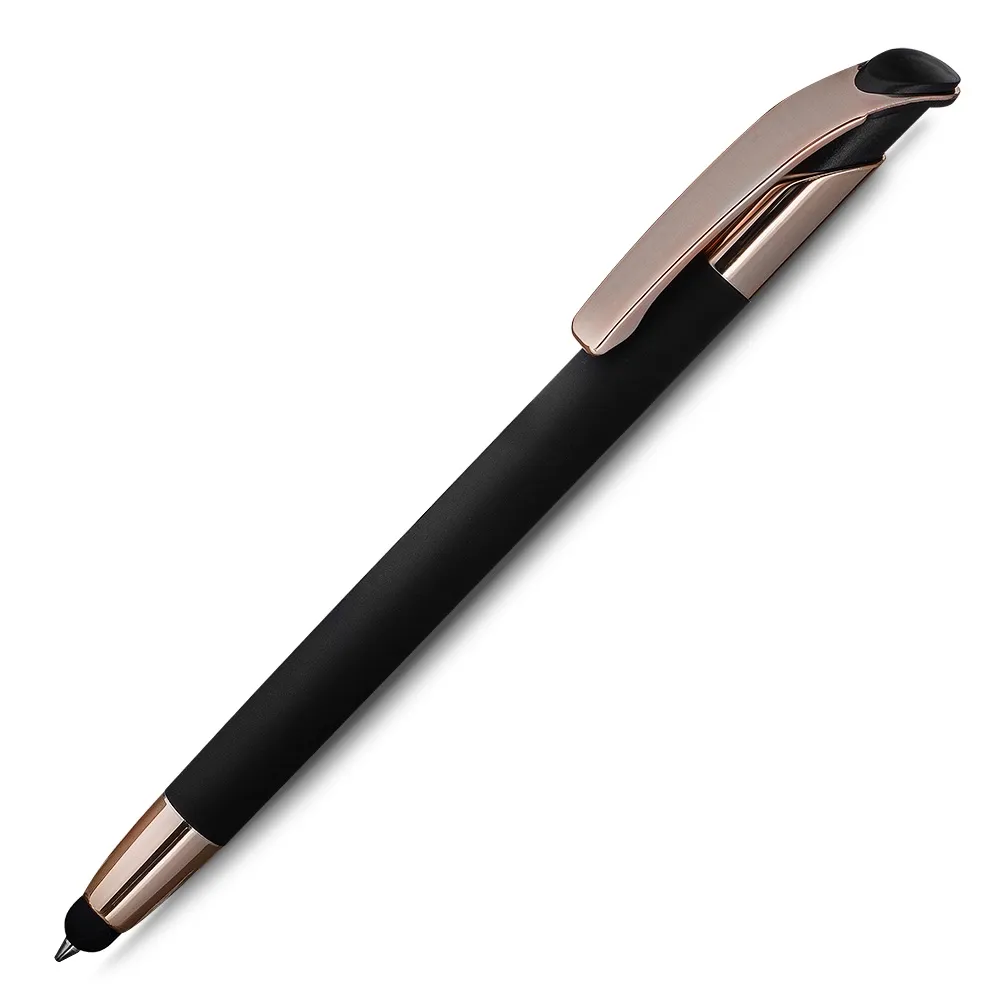 Caneta esferográfica em metal escrita em azul com detalhe em dourado rosé. Refil tipo parker e ponta touch emborrachada.\r\n\r\n*apresenta símbolo de reciclável na parte traseira da caneta.