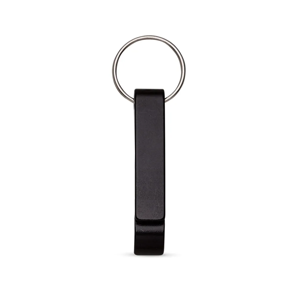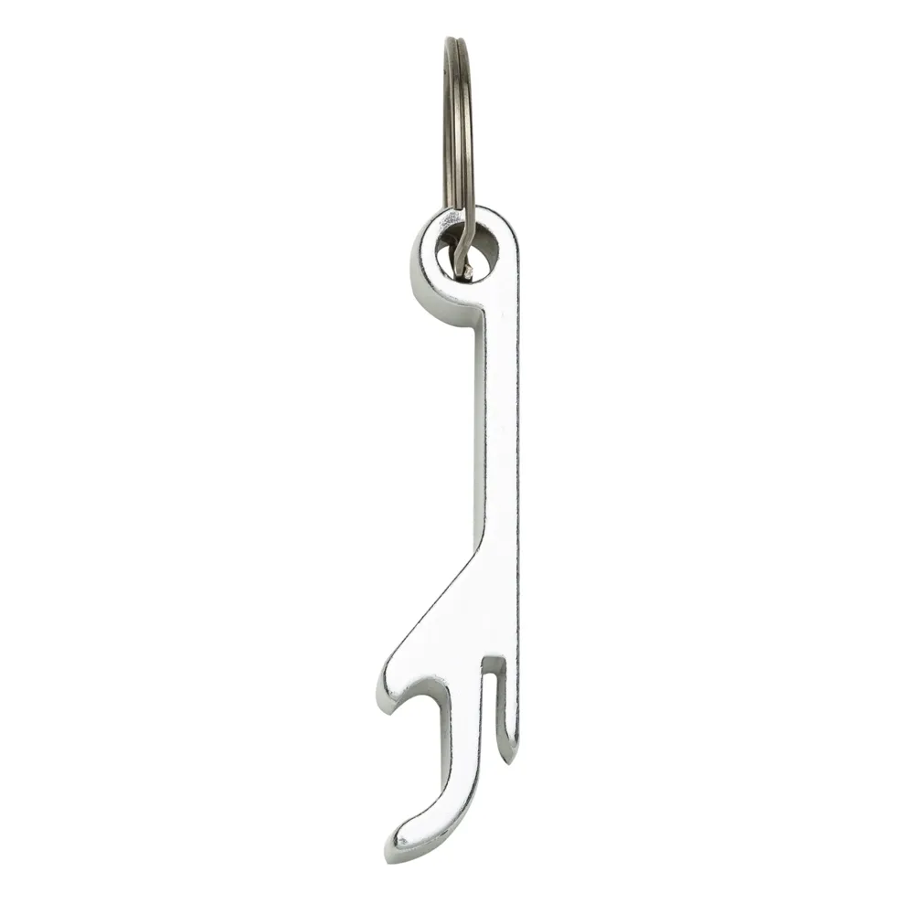 Chaveiro metálico com abridor de garrafas e argola de ferro niquelado.