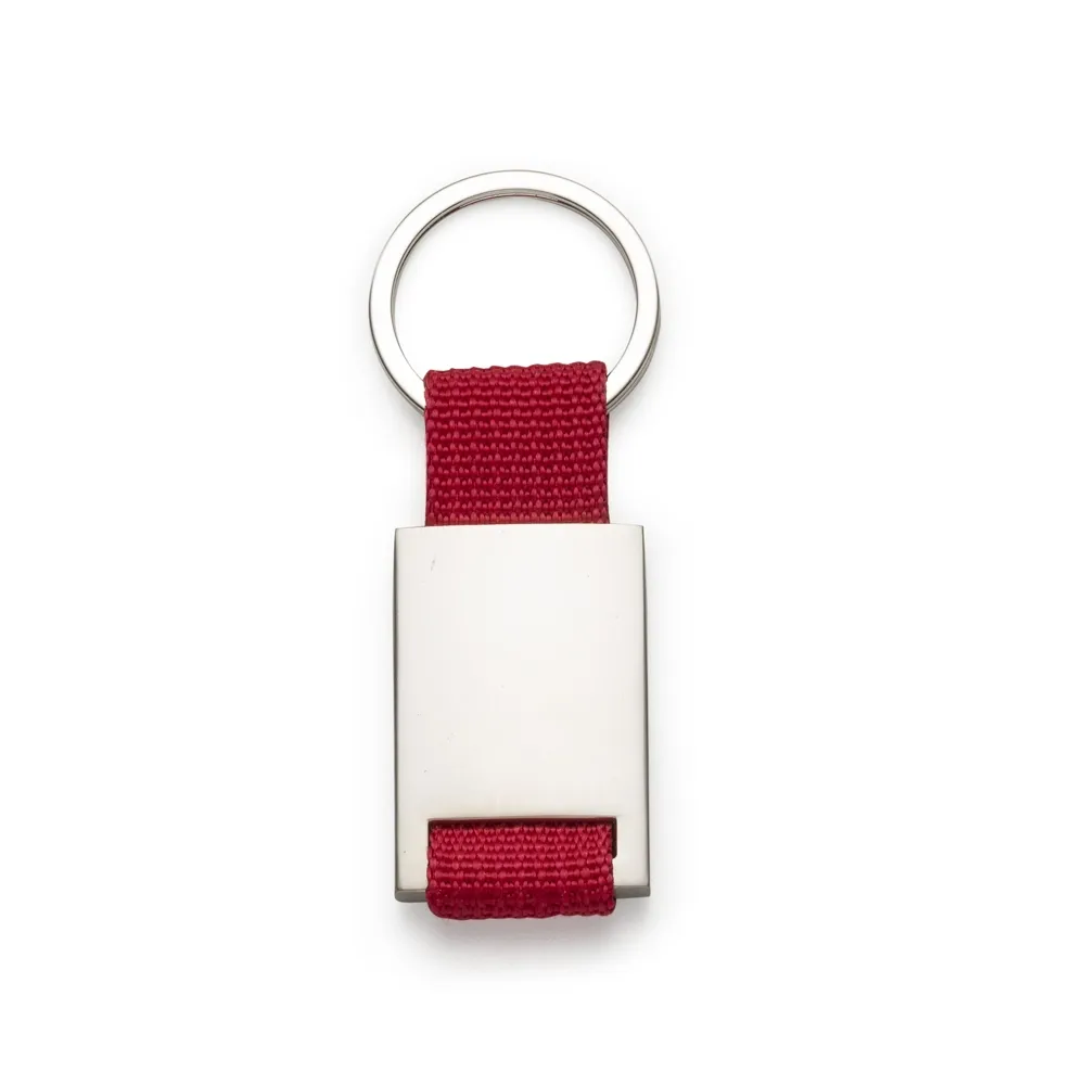 Chaveiro de metal com detalhe colorido em nylon. Metal liso e fosco de ambos lados.