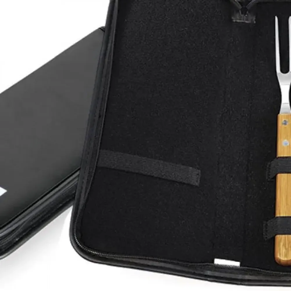 Conjunto composto por uma faca 8” e garfo trinchante em Madeira/Inox. Estão organizados em fita elástica preta no interior de um estojo confeccionado em poliuretano preto com toque almofadado, fechamento em zíper e acabamento em costura lateral.