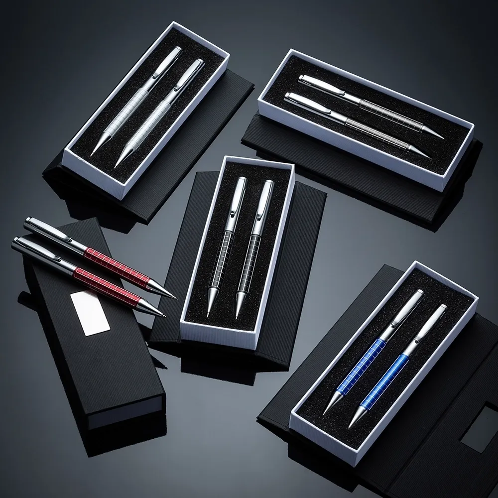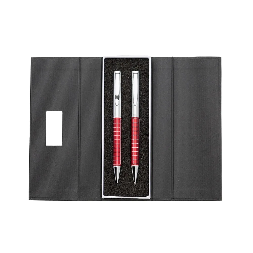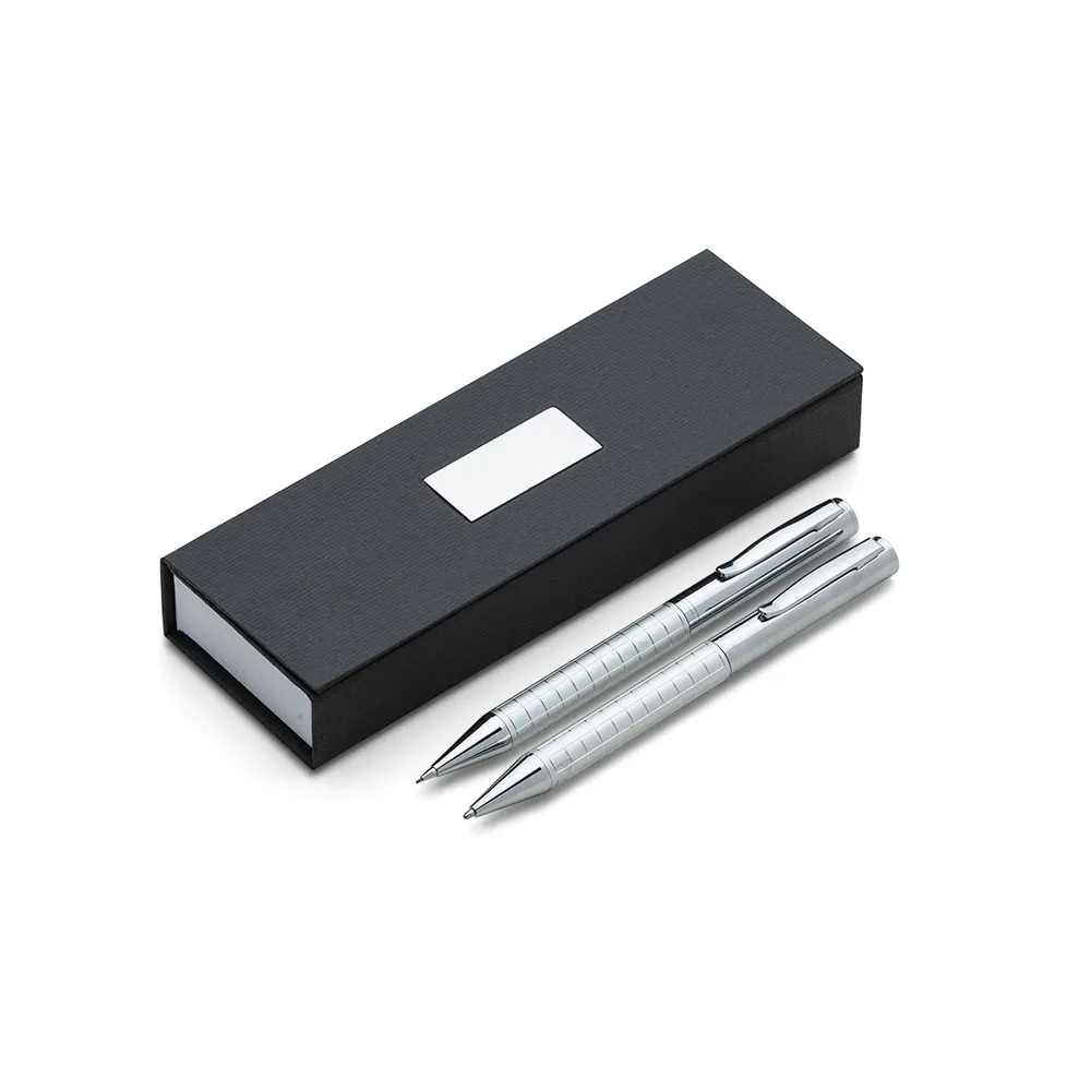 Kit caneta e lapiseira de metal em estojo papelão com placa de metal(parte interna do estojo revestida com espuma). Caneta e lapiseira prata com detalhes coloridos e quadriculados, clip metal com anel superior na ponta e dois anéis centrais e acionam por giro.