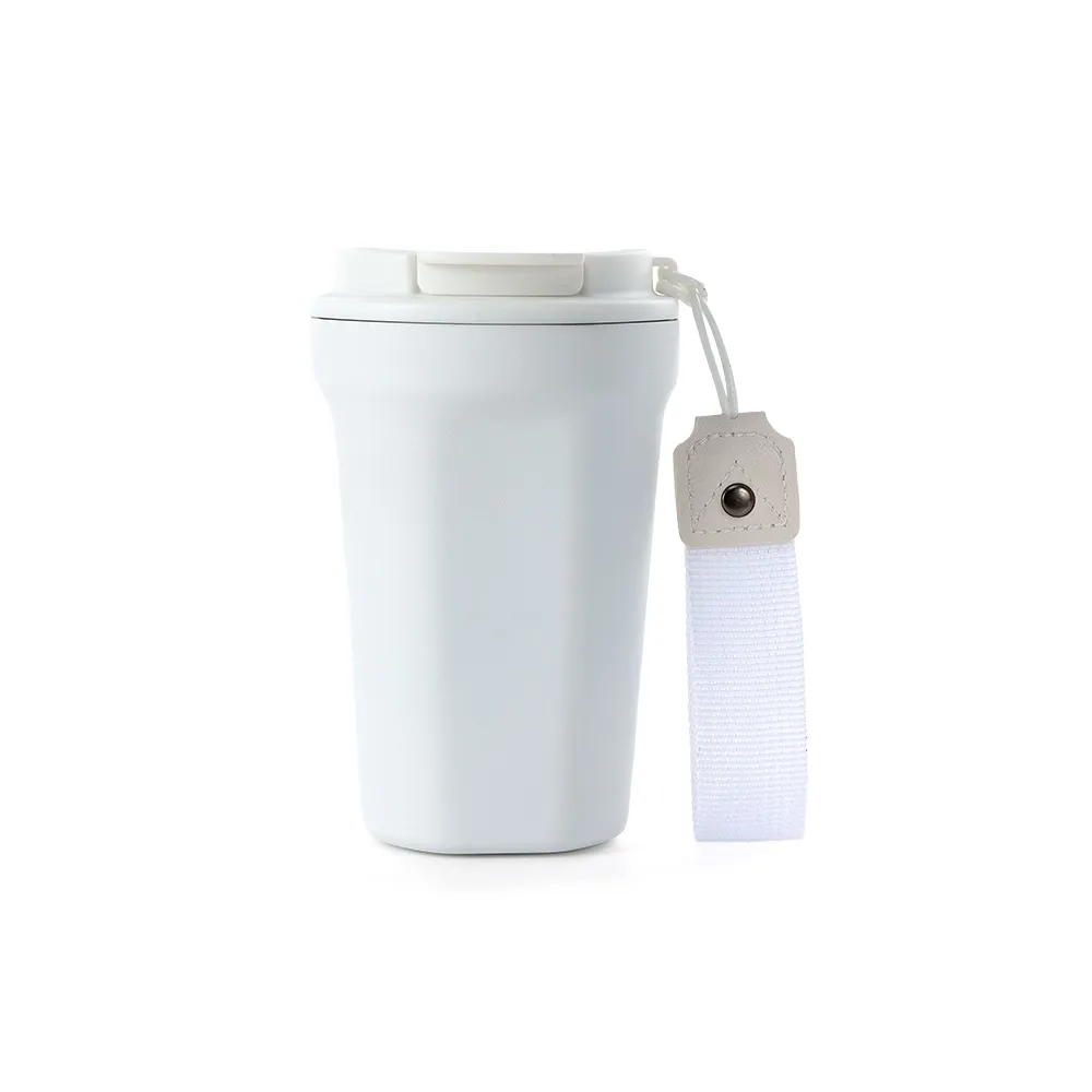 Copo térmico de inox 350ml com parede dupla, parte inferior com borracha antideslizante, tampa plástica rosqueável com abertura de bocal e alça de nylon para transporte com detalhe em couro sintético.