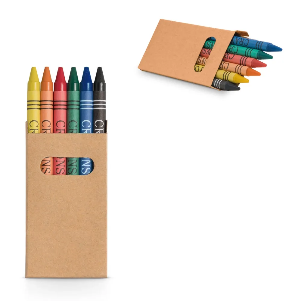 Caixa de papel kraft reciclado com 6 gizes de cera. Produto certificado de acordo com a portaria Inmetro nº423 de 8/out/2021. 53 x 92 x 9 mm
