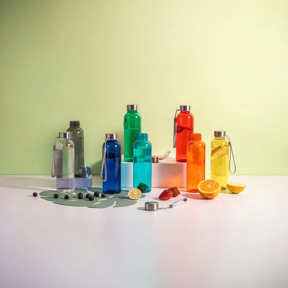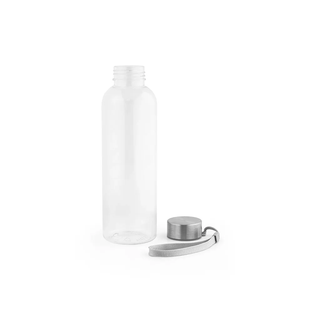 ENDERS. Squeeze em PET 100% reciclado e tampa em aço inox, com pega em corda 580 mL