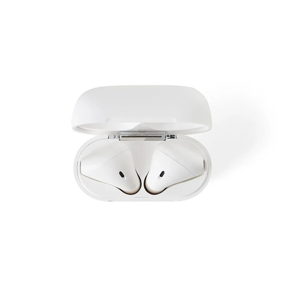 Fone de ouvido bluetooth com comandos touch, microfone e case carregador de fechamento magnético. Fones e case com acabamento brilhante, acompanha USB Lightning.