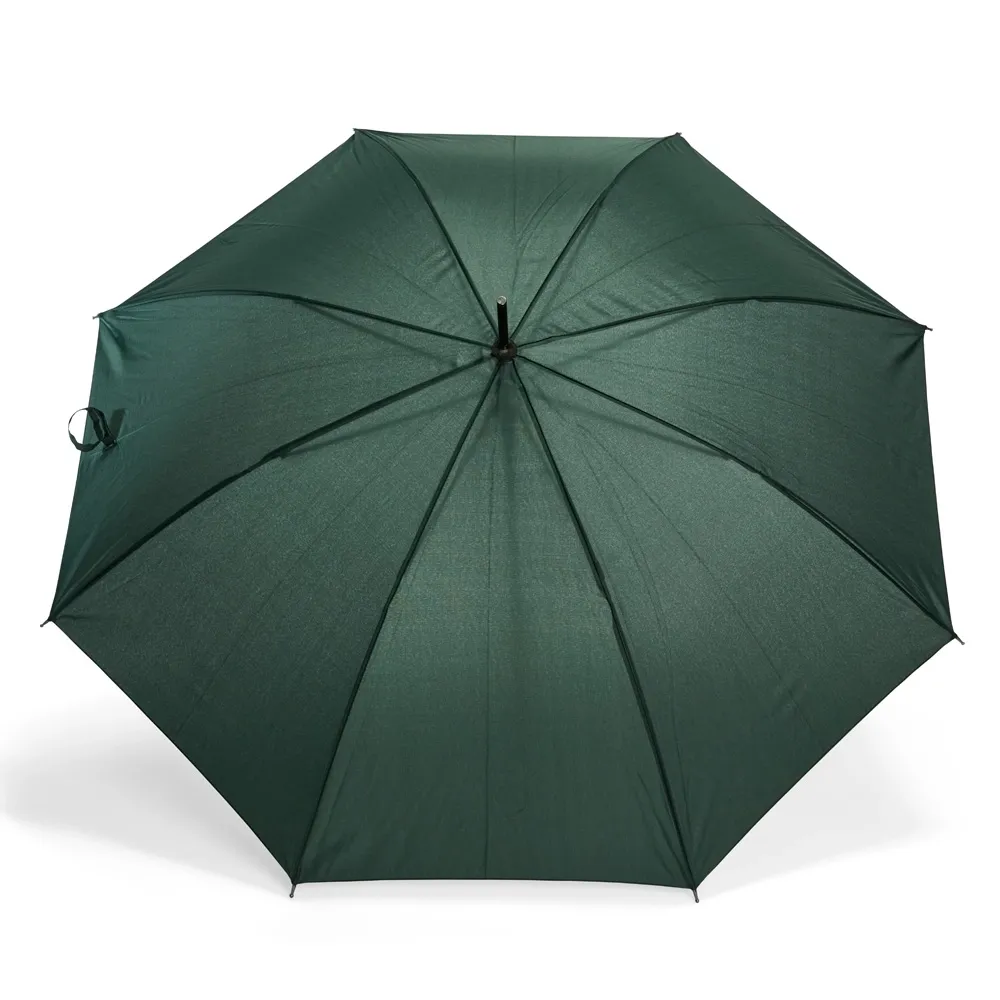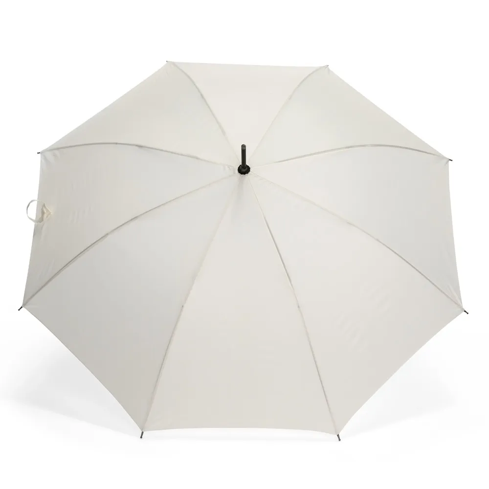 Guarda-chuva com abertura automática, estrutura em aço e 8 varetas em fibra de vidro. Possui pegador de madeira com alça de nylon e botão de acionamento.