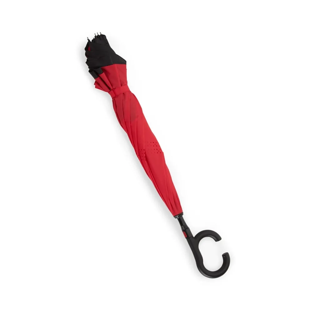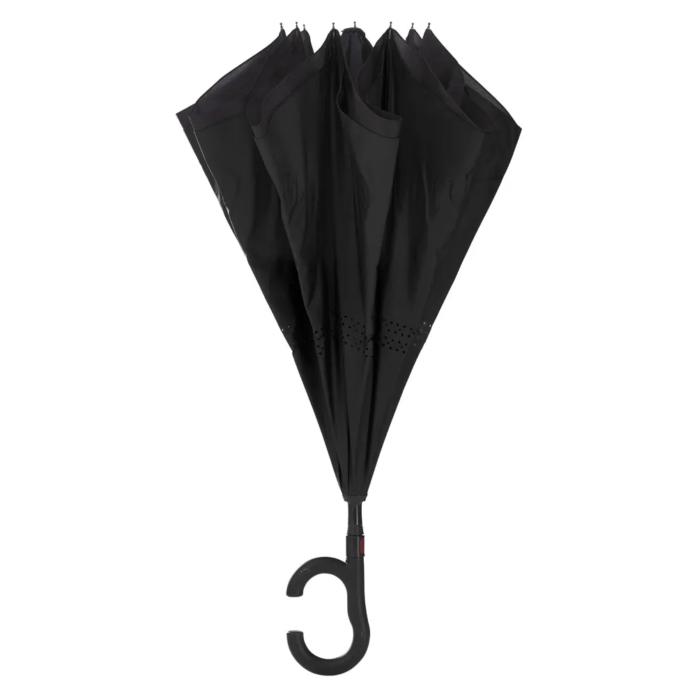 Guarda-chuva invertido com forro interno. Tecido ponge chinês e seda poliéster, possui um mecanismo inovador permitindo que o usuário não se molhe ao entrar e sair de ambientes devido sua abertura invertida, quando feito o movimento para fechar as varetas inverterão para cima criando um formato circular impedindo a chuva de atingir o usuário, podendo “segurar” a chuva enquanto entra/sai de um ambiente, ao virar o guarda-chuva a água irá escorrer. Forro interno para preservação das 8 varetas, evitando contato com a água e assim prolongando seu tempo de uso sem enferrujar. Ao impulsionar o fechamento invertido fica mais rápido e prático o modo de secar e ser guardado, pode ser apoiado no chão que permanecerá em pé para escorrer a água. Pegador plástico fosco em formato C, botão acionador vermelho e fita com velcro para lacre.