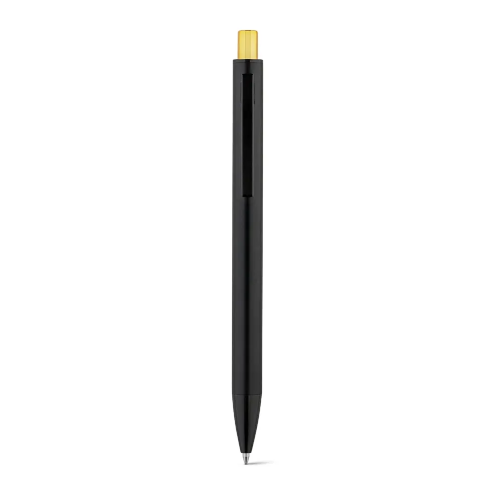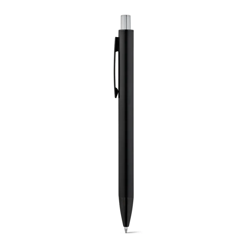 Esferográfica em alumínio com acabamento mate, botão com acabamento brilhante e clipe de metal. Corpo com duplo acabamento. Escrita em azul. ø10 x 140 mm