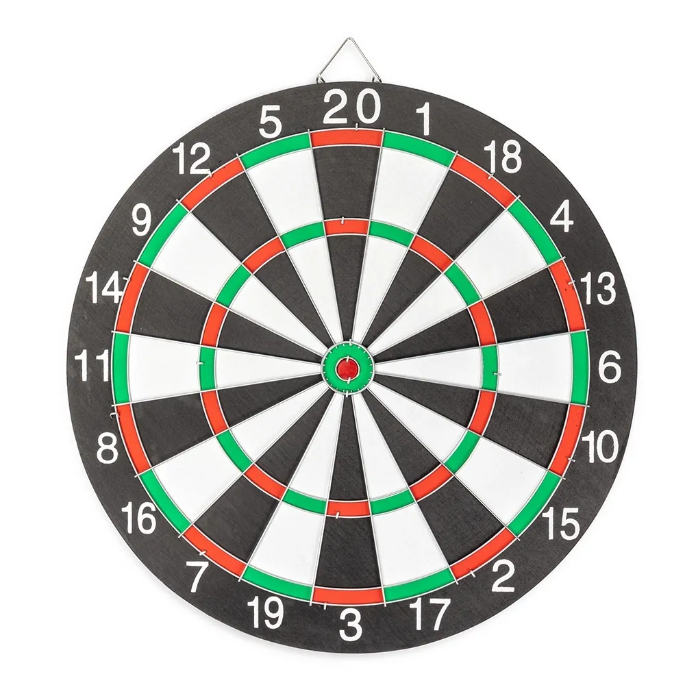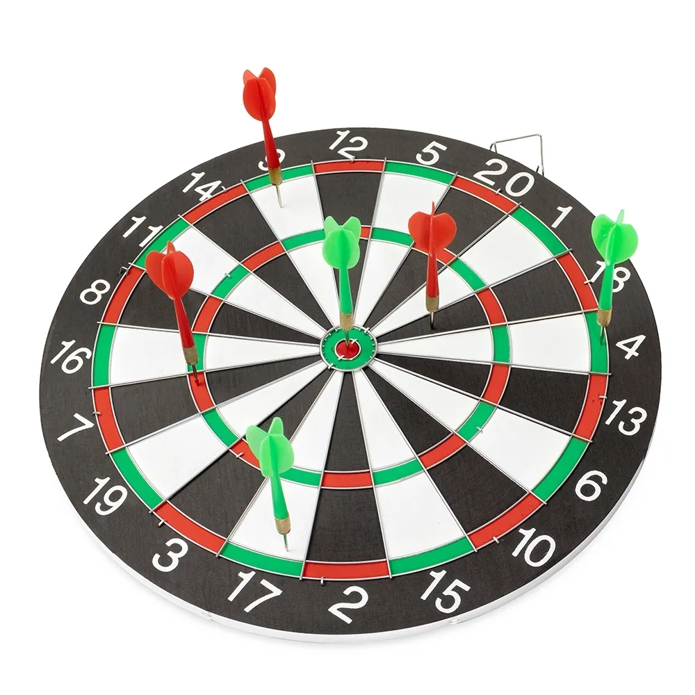 Conjunto para jogo de dardos composto por um alvo dupla face em madeira com alça e outros detalhes em metal e seis dardos com pontas metálicas e acabamento em plástico.