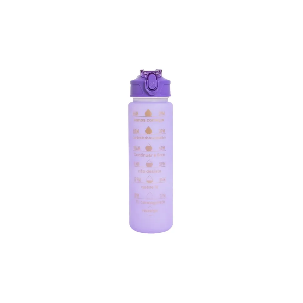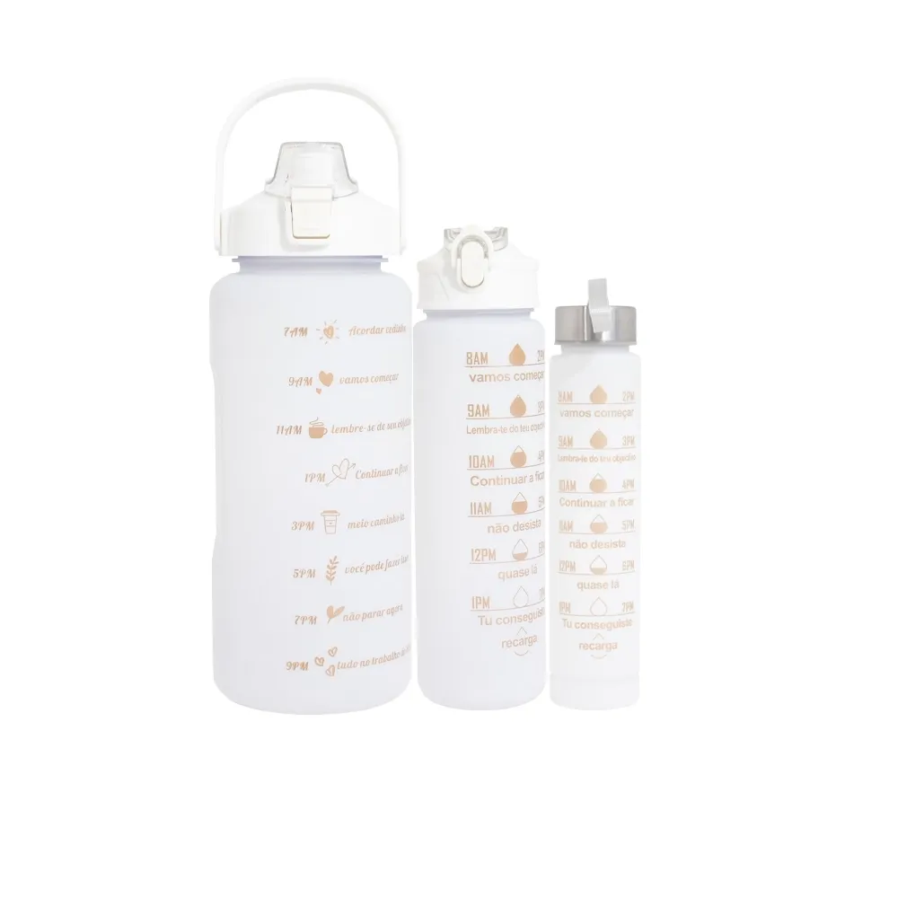 Kit com 3 garrafas plásticas, sendo um squeeze galão com capacidade de 2 litros, squeeze 750ml e garrafa 300ml. Squeeze 2L com alça para transporte e suporte para celular, botão de acionamento e tampa de proteção para o bocal; squeeze 750ml com botão de acionamento, trava de segurança e tampa protetora para o bico de silicone; garrafa 300ml com tampa de alumínio e alça de nylon para transporte. Acompanham dois canudos e acessórios de extensão de canudo.