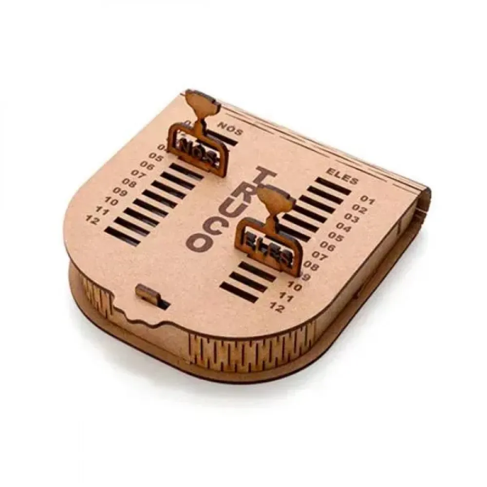 Kit para Churrasco, Cerveja e Truco. Composto por tábua com três furos em Bambu; garfo trinchante e faca 8 em Madeira/Inox; quatro copos de Cerveja em vidro; caixa para truco com jogo de cartas, marcador de tentos e jogos em MDF.\nComo cortesia, na faca 8 fazemos uma gravação com os cortes do boi.