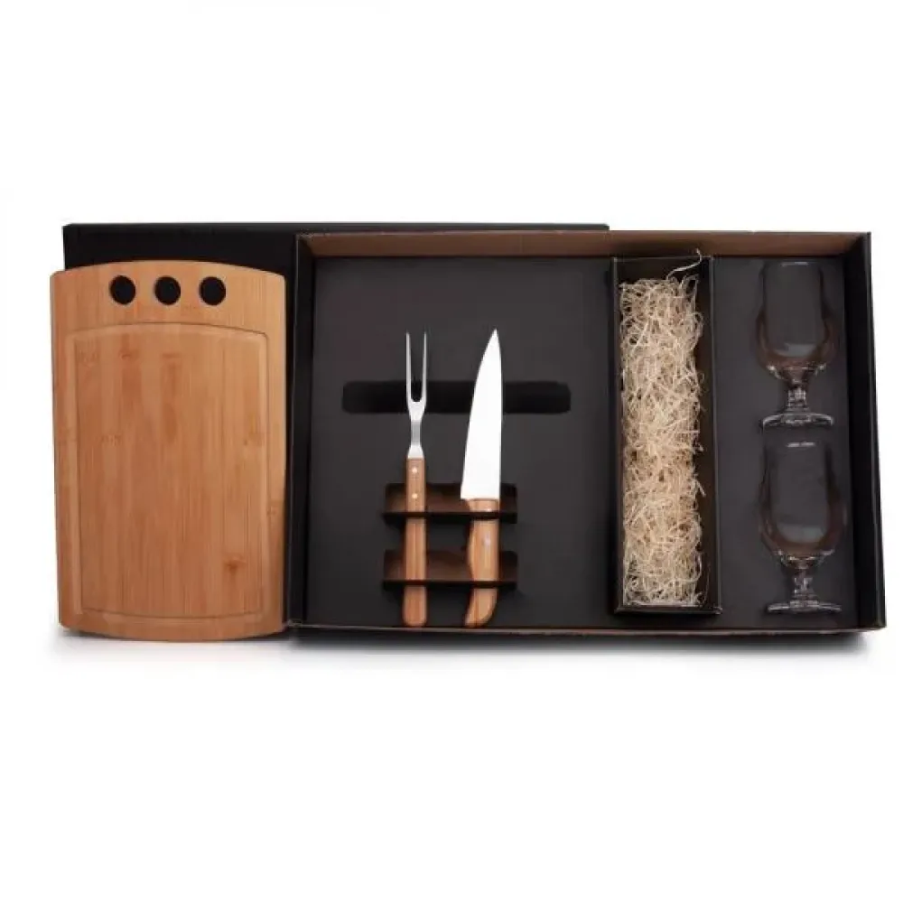 Acompanha tábua com três furos em Bambu; faca 7 em Bambu/inox; garfo trinchante em Madeira/Inox; duas taças de Cerveja em vidro e espaço para garrafa com palha (NÃO ACOMPANHA GARRAFA). \nComo cortesia, na faca 7 fazemos uma gravação com os cortes do boi.
