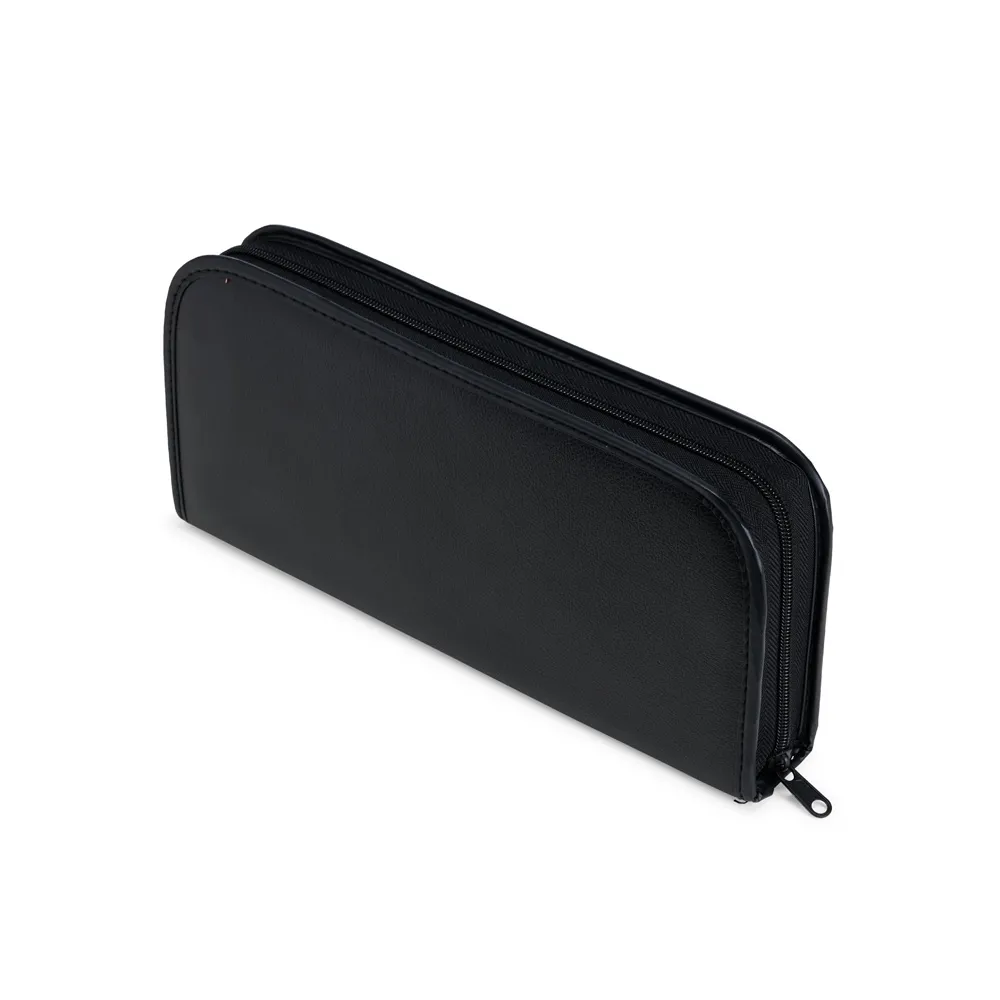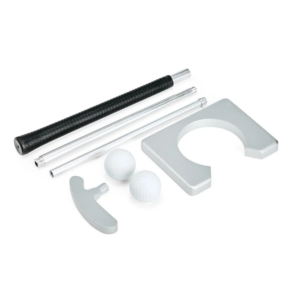 Kit para treino de golfe com quatro itens: taco montável em metal, moldura de alvo em MDF em formato de buraco e duas bolinhas em material sintético. Acompanha estojo em couro sintético com fechamento em zíper para acomodar o conjunto.
