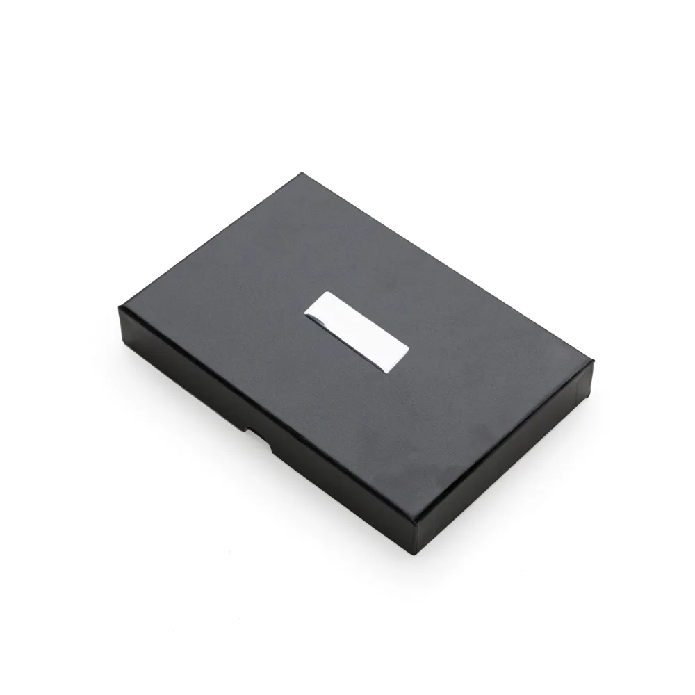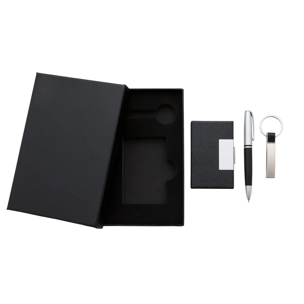 Kit executivo 3 peças em estojo de papelão com tampa e parte interna revestida de espuma. Contém: chaveiro metal fosco com detalhe emborrachado preto, porta cartão de couro sintético(verso metálico liso) com placa de metal e caneta metal fosca com detalhe emborrachado preto. Acompanha placa metálica para gravação.