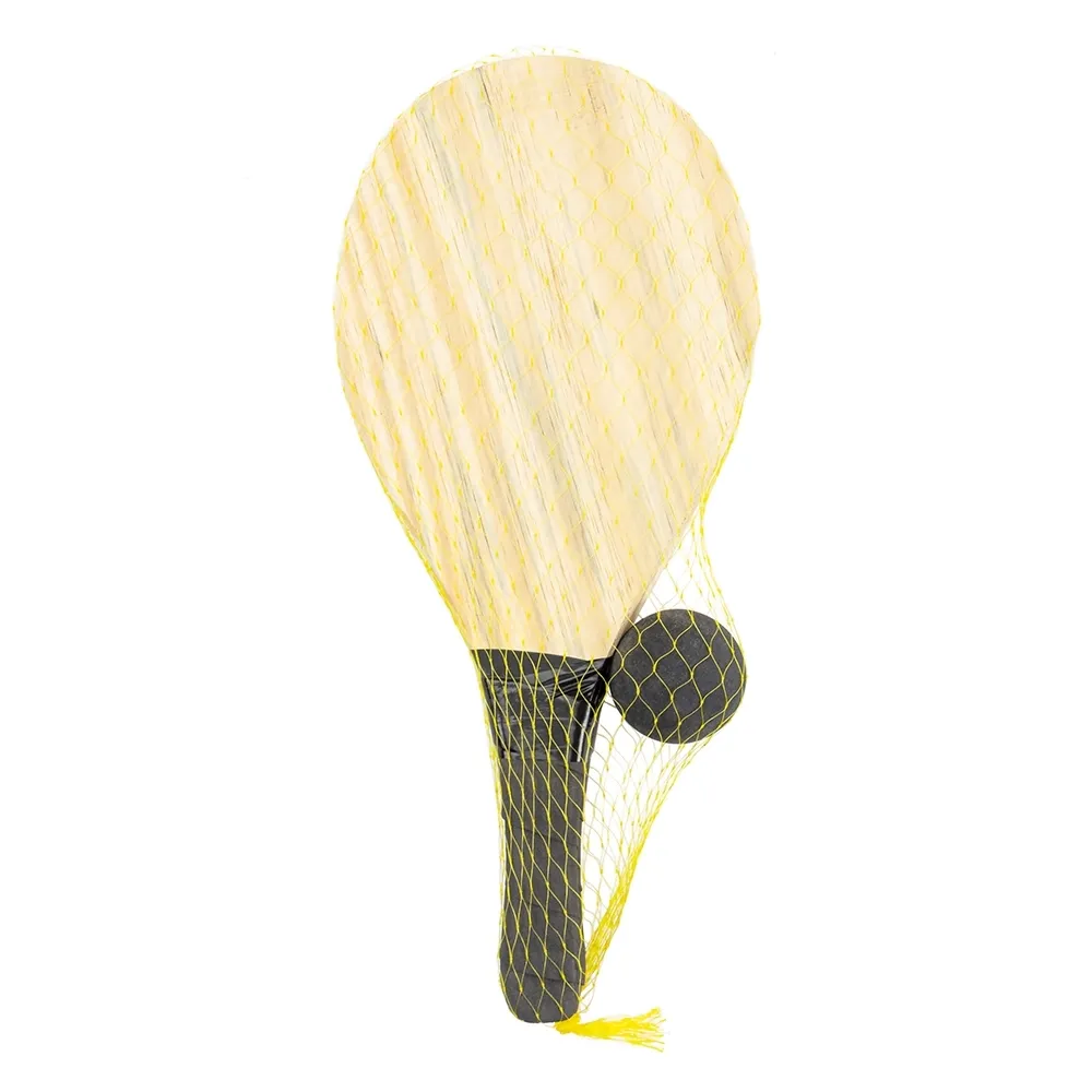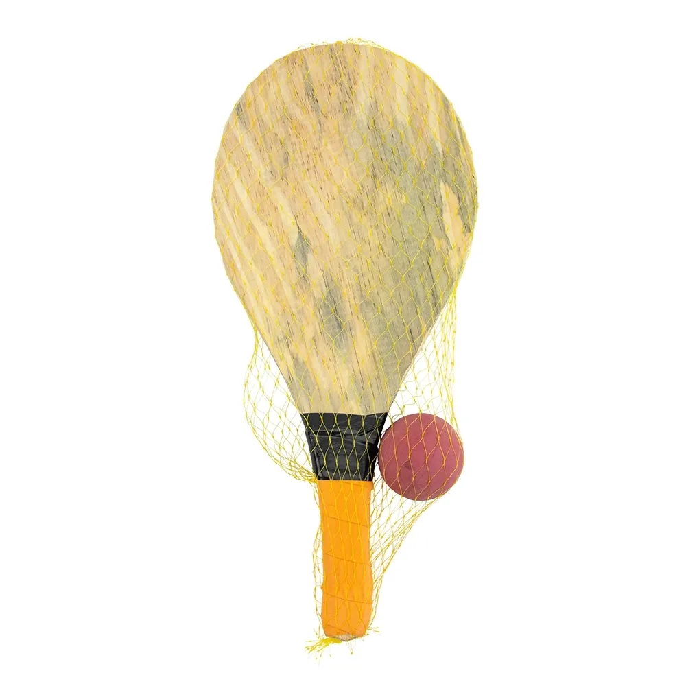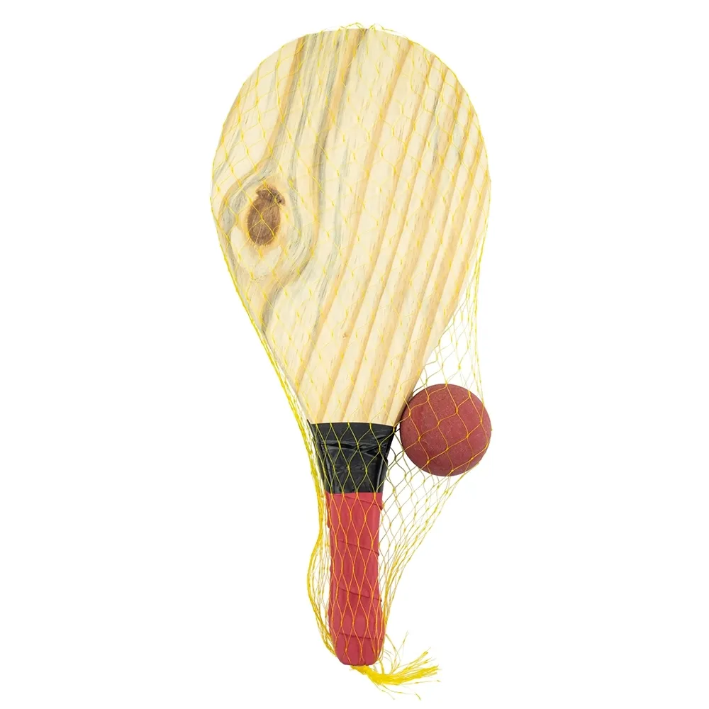 Kit frescobol com embalagem de malha plástica. Contém 2 raquetes de madeira com pegador de revestimento EVA e bolinha emborrachada.