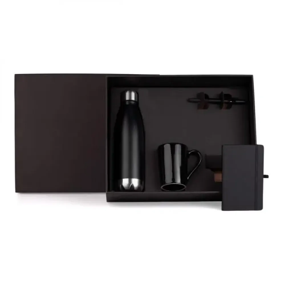 Kit garrafa e acessórios. Composto por garrafa em aço Inox preta com tampa rosqueável; caneca em cerâmica preta; caderno para anotações preto com capa dura e caneta esferográfica em ABS preta.