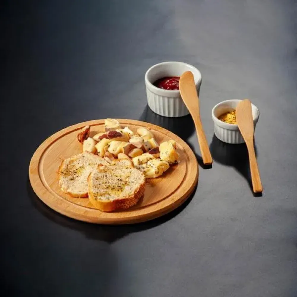Kit para petisco. Conta com tábua redonda com sulco e duas espátulas 14cm em bambu; Dois ramekins, um pequeno e um mini em porcelana.\nEstão perfeitamente acomodados em uma caixa para presentear.