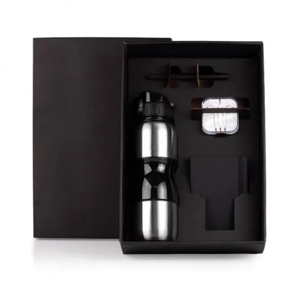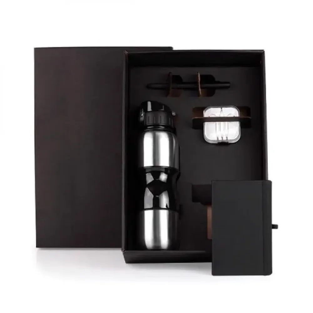 Conta com squeeze em aço inox; fone de ouvido; caderno sem pauta e caneta em plástico ABS prata.\nSqueeze fumê revestido em Aço Inox 750ml. Acompanha copo rosqueável 200ml.\nCaneta com tampa e ponta touch.\nCaderno com 80 folhas não pautadas.\nFone de ouvido conta com microfone e controle de volume.