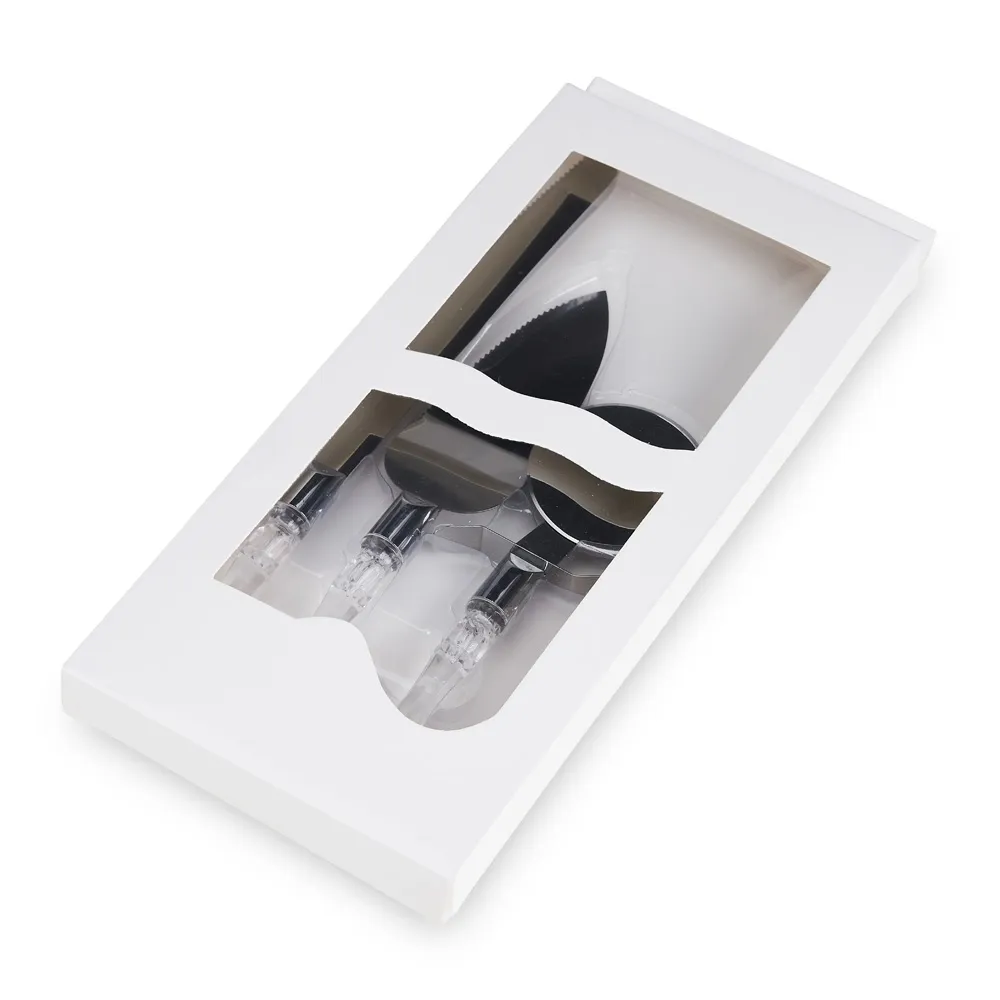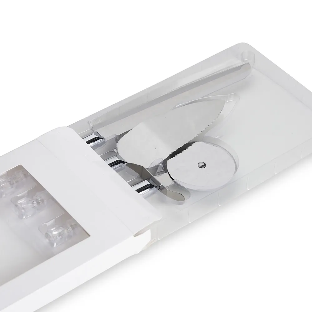 Kit utensílios de cozinha com 3 peças, composto por cortador de pizza, espátula e faca em inox com cabos plásticos. Acompanha estojo de papel.\r\n