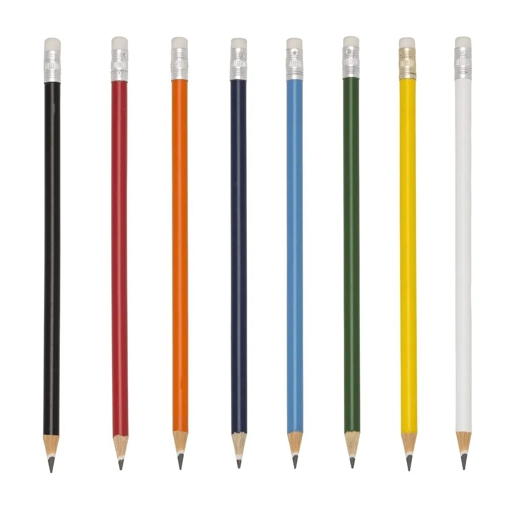 Lápis resinado colorido com borracha e grafite preto, guarnição prateada.