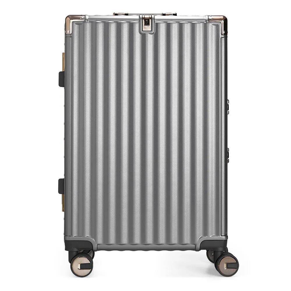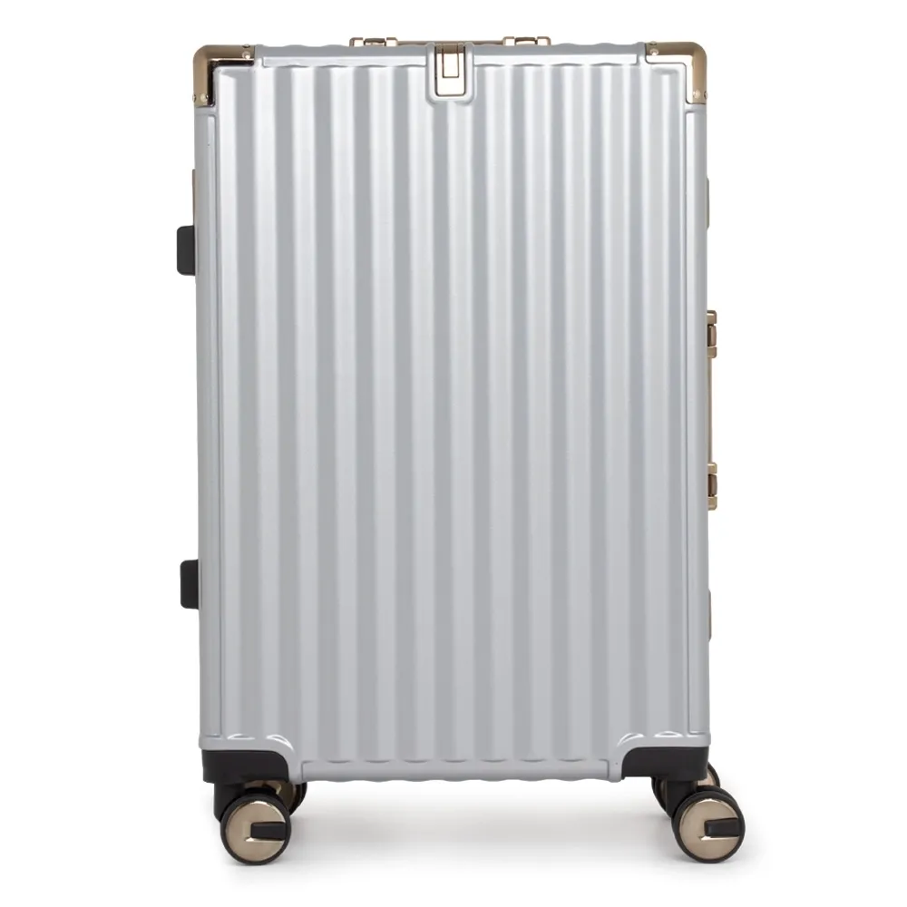 Mala de viagem 64 litros feita em plástico com acabamento em alumínio, contém cadeado numérico TSA. Compartimentos internos com bolso telado, bolso plástico para itens molhados e cinta compressora para roupas. A mala possui duas alças de mãos, puxador retrátil com regulagem de tamanho, suporte porta bolsa, quatro rodinhas 360º e apoios laterais.