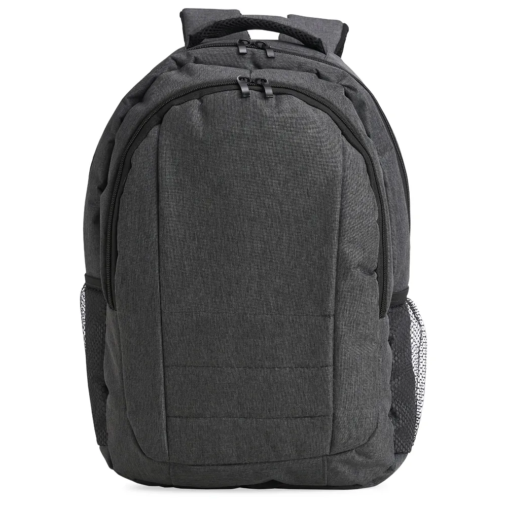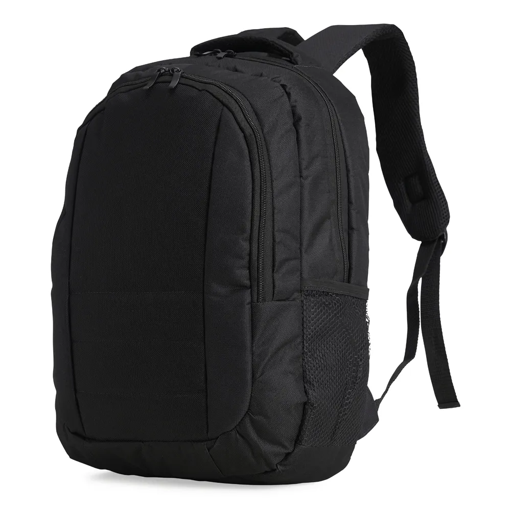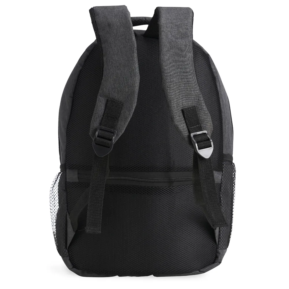 Mochila de nylon e oxford 26 litros com 3 compartimentos, sendo o principal com bolso para notebook 15’6 com fecho de velcro, compartimento mediano frontal com divisórias internas e compartimento na área costada. Contém bolsos laterais telados, alça de mão, alça de costas e área costada com revestimento espumado.\r\n