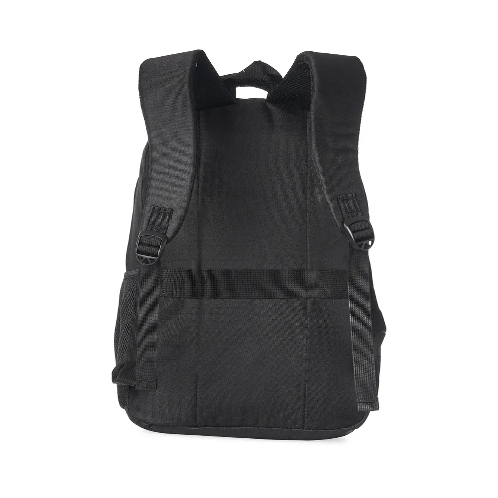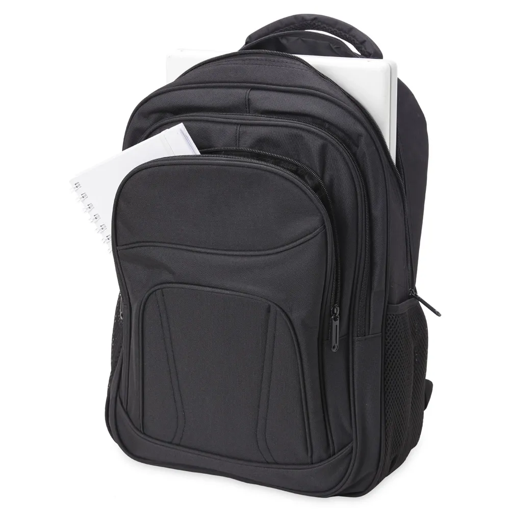 Mochila de nylon 30 litros com três compartimentos, sendo o principal com bolso para notebook 15,6.Com bolsos laterais telados, a mochila possui alça para encaixe em malas de viagem, duas alças de mãos e alças para as costas com revestimento espumado. Acompanha plaquinha metálica.