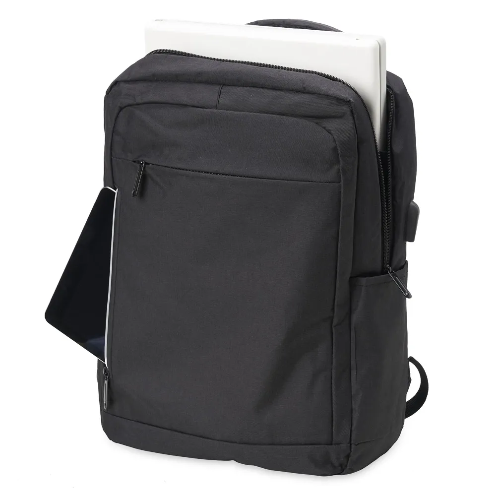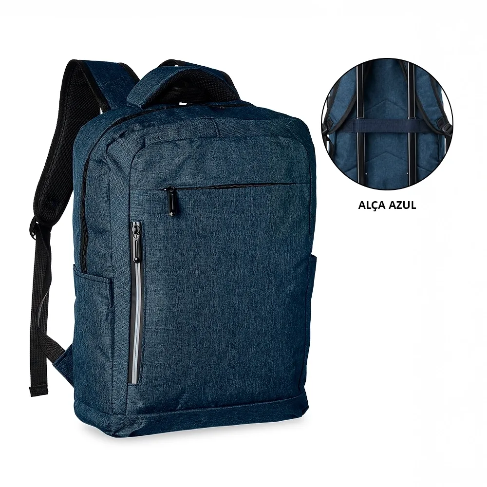 Mochila de nylon 20 litros com três compartimentos, sendo o principal com bolso para notebook 15,6. Com bolsos laterais e faixa frontal refletiva, a mochila possui adaptador USB externo, alça para encaixe em malas de viagem, duas alças de mãos e alças para as costas com revestimento espumado. Acompanha plaquinha metálica.