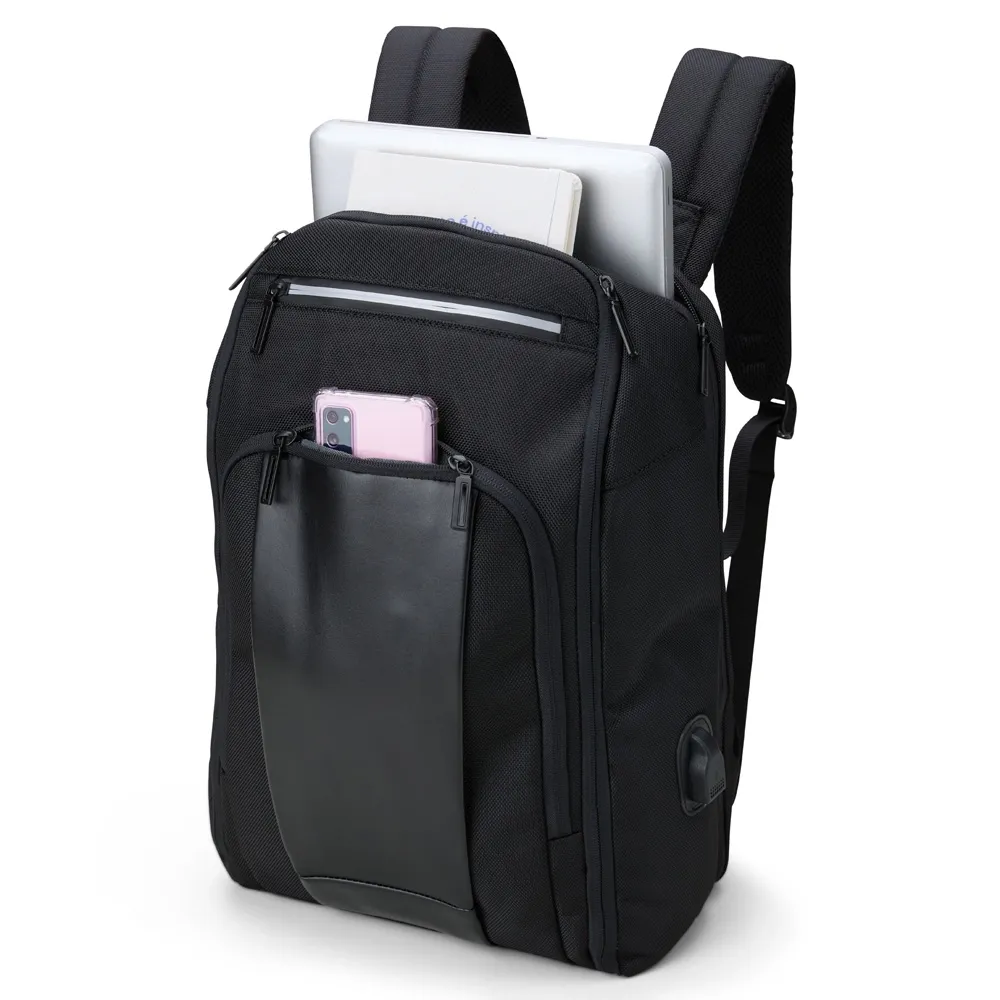 Mochila confeccionada em Nylon 22 litros com detalhes em couro sintético. Contém 5 compartimentos, sendo um bolso com faixa refletiva, divisórias internas para acessórios, bolso para tablet e notebook 15.6, bolso antifurto nas costas, bolso externo na lateral com elástico, suporte externo USB, alça para encaixe em malas de viagem, alças da mochila possuem bolsos integrados para suporte de óculos e cartões.