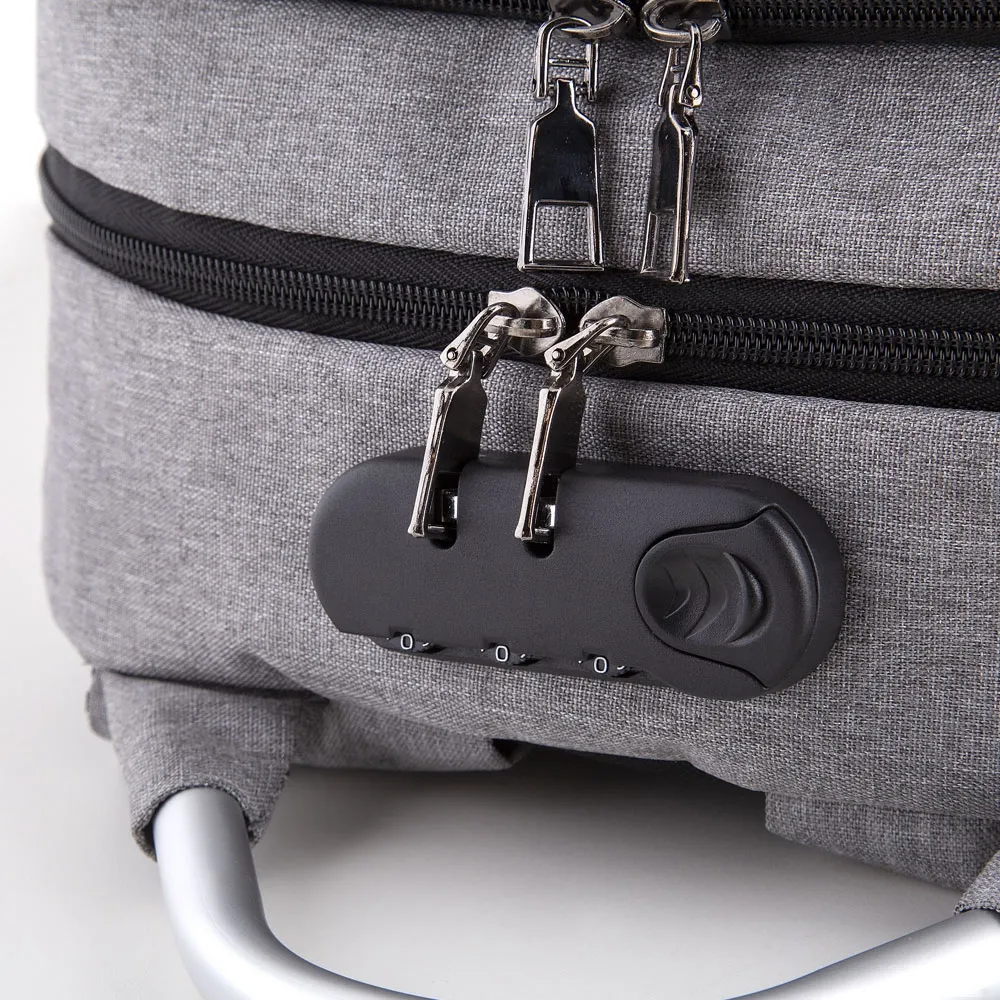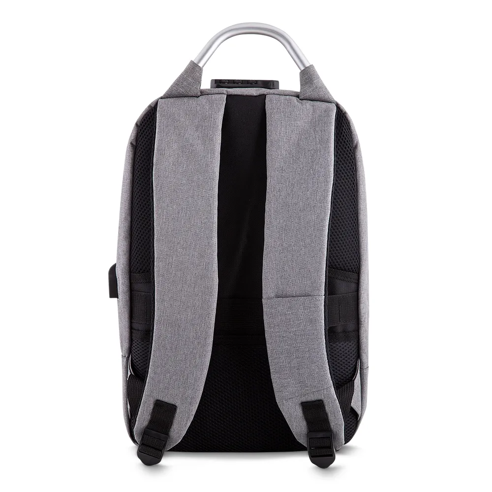 Mochila para notebook em tecido poliéster 50% Oxford e 50% PU e interior em poliéster 210D.\r\n\r\nParte externa:\r\nPossui fechamento em cadeado com segredo;\r\nAlça de mão em metal;\r\nAlça de ombro acolchoada;\r\nMini bolso na alça de ombro;\r\nFita refletiva noturna.\r\nEngate para mala da viagem;\r\nBolso frontal grande.Saída USB e fone de ouvido.\r\n\r\nParte interna:\r\nDivisórias internas para canetas, documentos e telefone celular.\r\n\r\nCompartimento acolchoado para notebook, 43x27cm.\r\n\r\nTamanho total do Notebook - 15.6 \r\n\r\n 35% OFF NA PLAQUINHA! \r\n Entre em contato com seu consultor para adicionar no pedido a plaquinha.\r\n*Desconto válido somente na compra dos itens: Mochilas, Necessaires e Bolsas Térmicas.\r\nVer plaquinhas