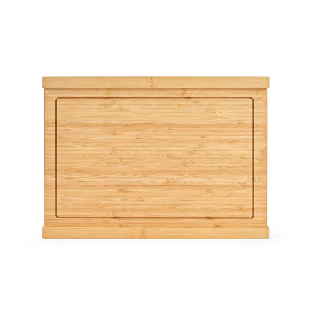 Conjunto de tábuas em bambu com 3 facas inclusas. Composto por duas tábuas: a tábua exterior e a tábua interior que assume duas funcionalidades - um compartimento para três facas inclusas (faca de legumes, faca de pão, faca de cozinha) e como tábua de corte. Fornecida em caixa presente de papel kraft reciclado. Certificação EU Food Grade. A cor e o resultado da impressão nos materiais naturais pode variar entre produtos. 390 x 280 x 45 mm | Tábua exterior: 390 x 280 x 15 mm | Tábua interior: 380 x 250 x 15 mm