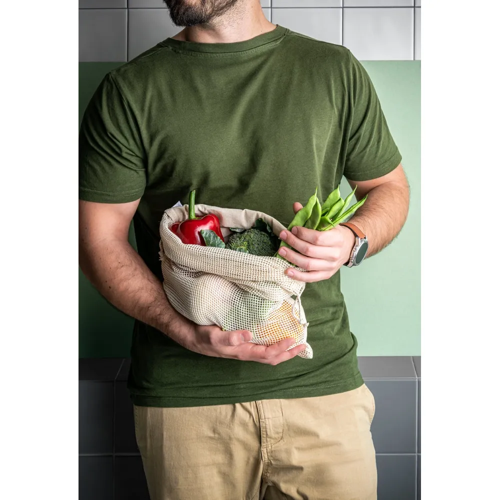 Sacola 100% algodão (120 g/m²) com malha 100% algodão na parte frontal (100 g/m²) e cordões em algodão para fechar. Sacola ideal para levar alimentos. 300 x 400 mm