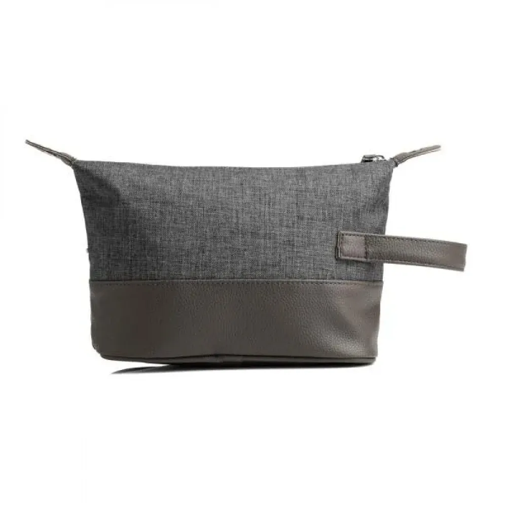Necessaire em Poliester 300D Melange Cinza com detalhes em couro.\nConta com dois compartimentos com zíper e duas extremidades com botão de pressão. Acompanha gancho em metal para pendurar; alça de mão e base em Material Sintético.