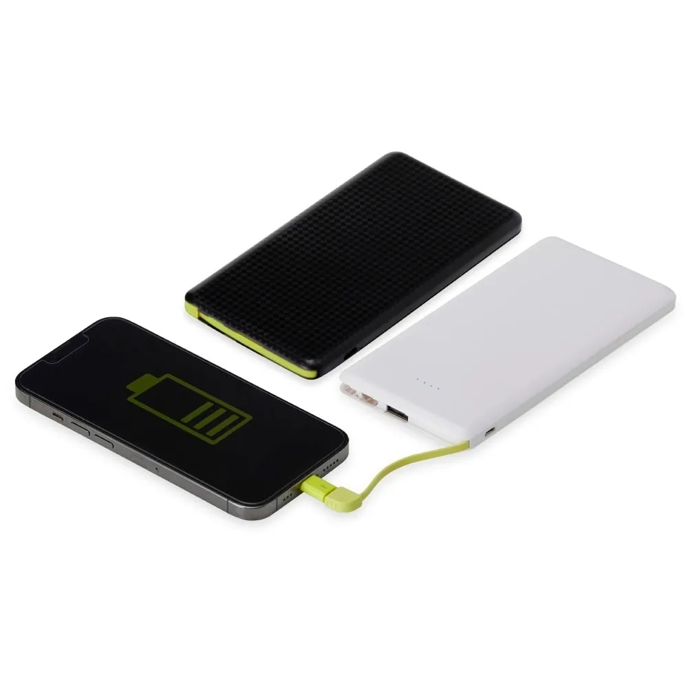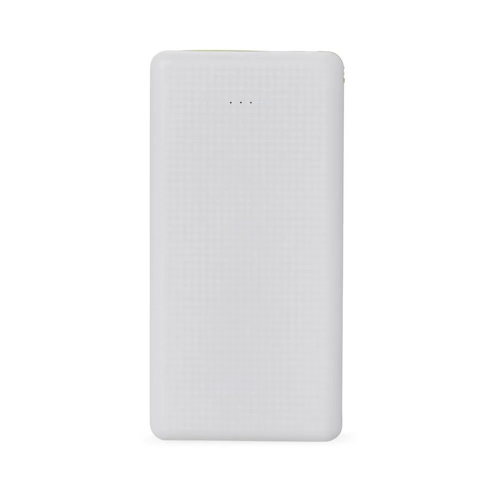 Carregador portátil plástico com 10.000mAh e indicador led de bateria. Possui entrada V8, acompanha cabo USB, adaptador lightning e adaptador tipo-C.