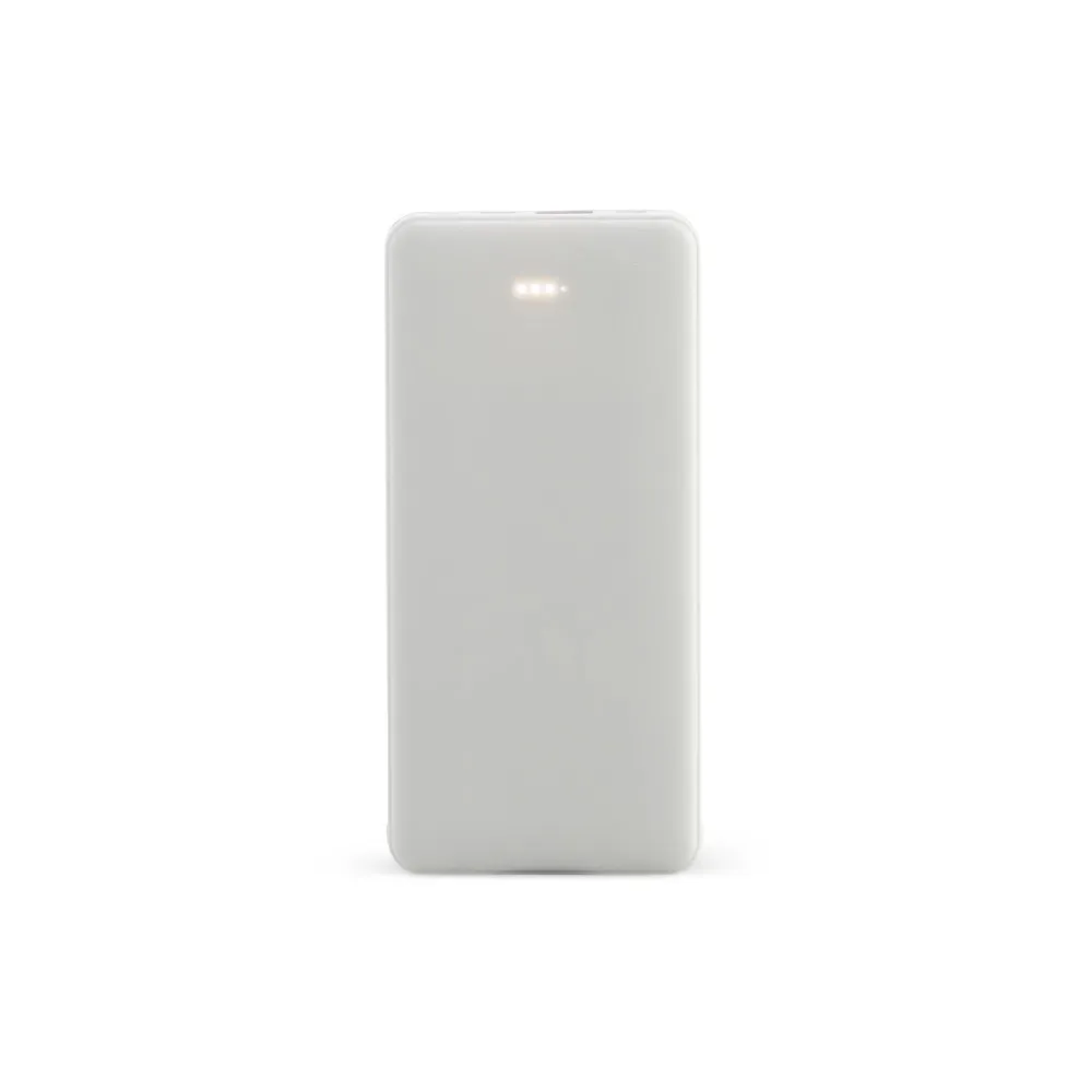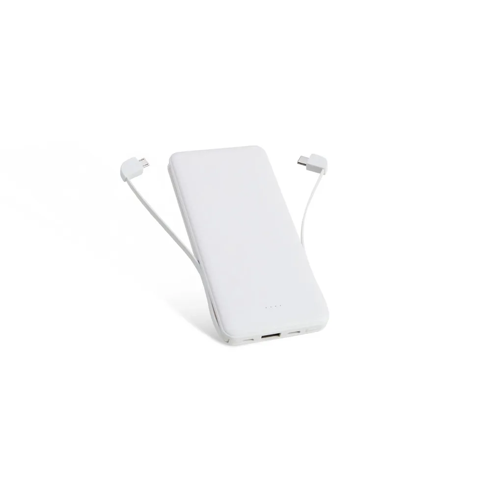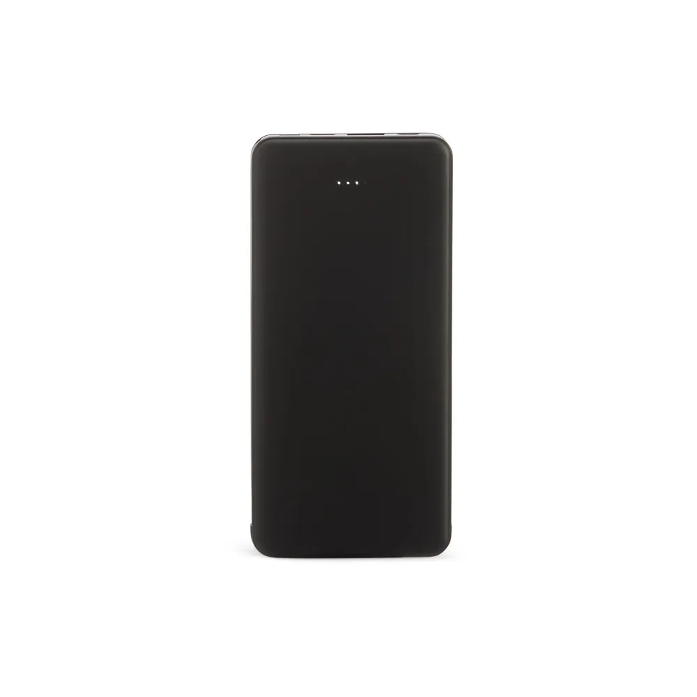 Power bank em plástico com capacidade de até 10.000mAh. Possui cabos com saídas USB-C e micro-USB e indicadores frontais em LED. Conta ainda com entrada USB e conexões micro-USB e USB-C dedicados à recarga do próprio carregador portátil. Acompanha cabo micro-USB e adaptador Lightning acoplado.
