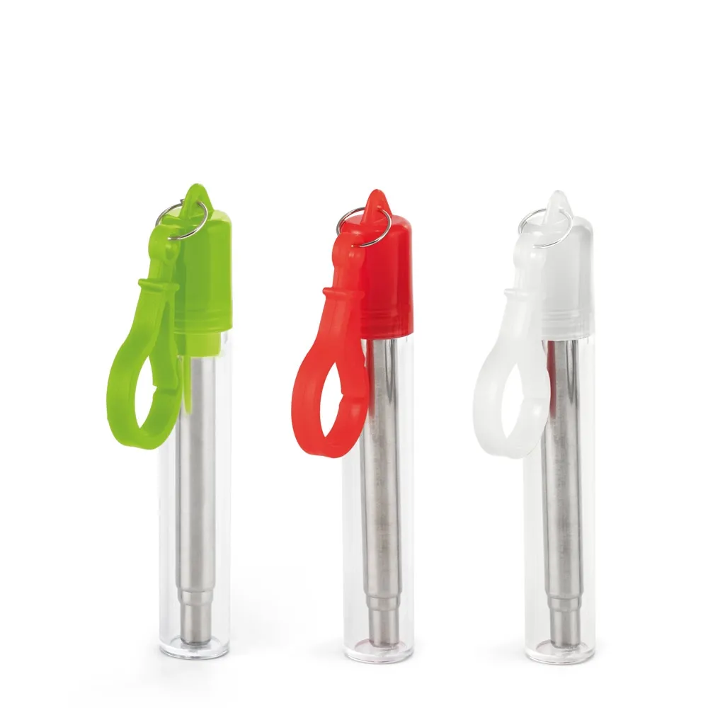 Conjunto de canudo em aço inox e escova de limpeza. Fornecido em estojo com mosquetão. Certificação EU Food Grade. Canudo: ø9 x 218 mm | Estojo: ø10 x 105 mm