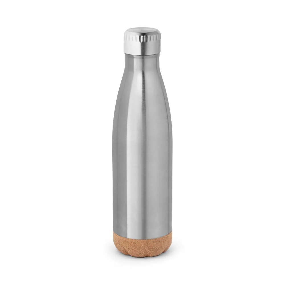 Garrafa em aço inox de parede dupla térmica, isolada a vácuo, com tampa em aço inox e base em cortiça. Capacidade até 560 mL. Mantém as bebidas quentes por 8h e frias por 24h. Fornecido em caixa presente de papel kraft reciclado. Certificação EU Food Grade. A cor e o resultado da impressão nos materiais naturais pode variar entre produtos. ø71 x 258 mm