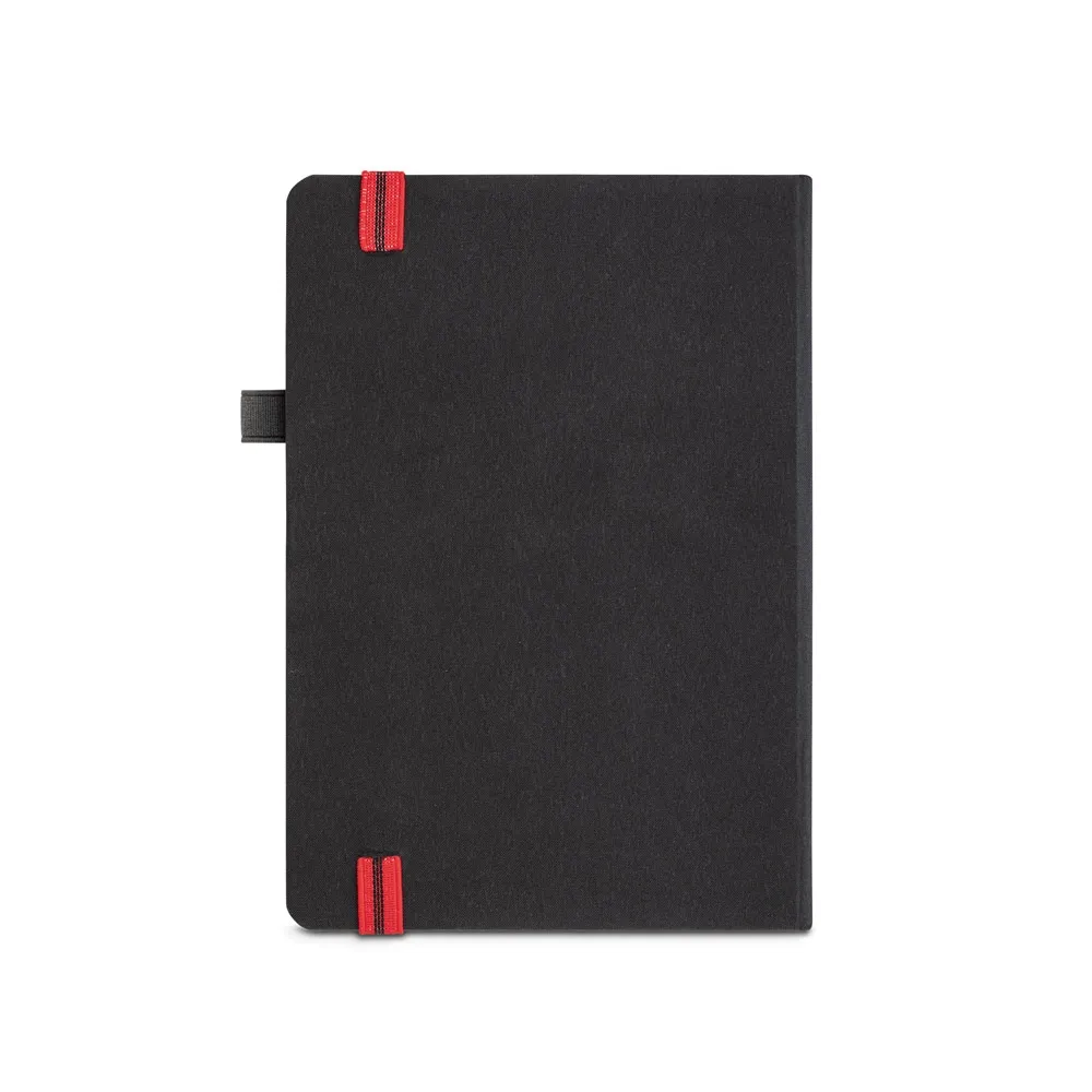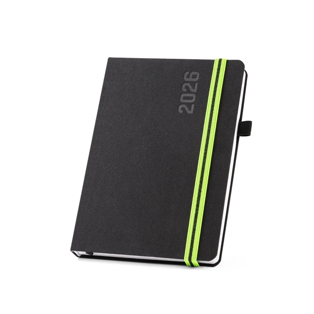 Agenda A5 em tecido poliéster. Com suporte para esferográfica (não inclusa) e marcador em fita. Está organizada num plano diário (70 g/m²). 145 x 212 mm