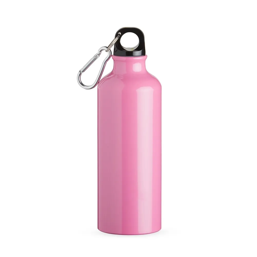 Squeeze 500ml de alumínio com pintura metalizada, tampa rosqueável e acompanha um segundo bico com mosquetão (não é térmico).