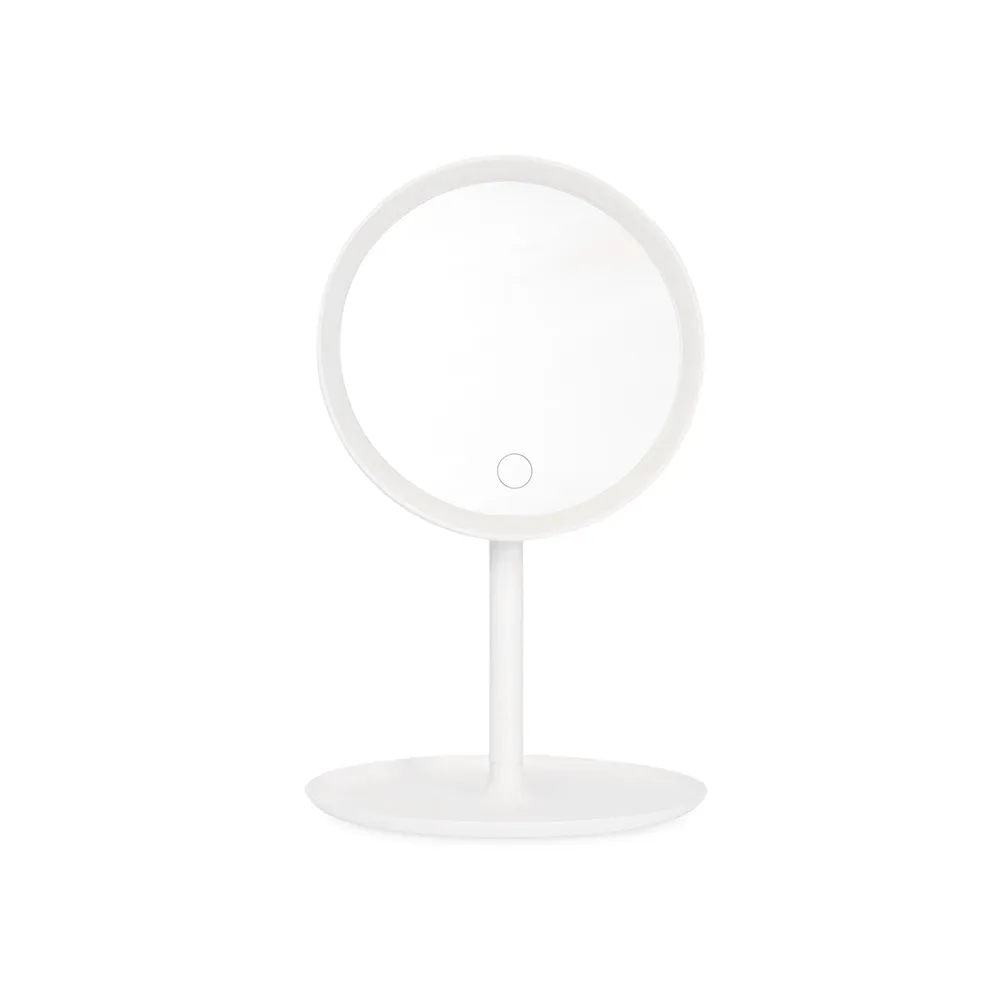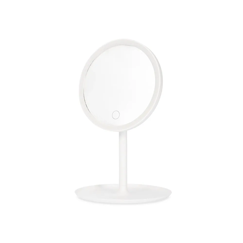 Espelho de mesa com estrutura plástica de fácil montagem e rotação de até 90 graus. Possui iluminação em LED recarregável com três níveis de intensidade ajustáveis pelo botão de toque no espelho. Acompanha cabo USB-C.