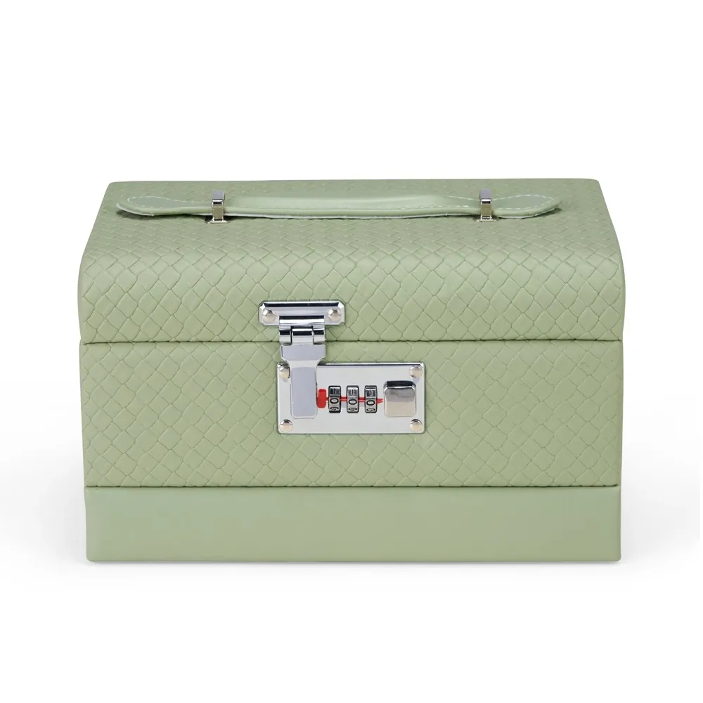 Maleta porta-joias em couro sintético com textura crocodilo, fechamento por cadeado com senha numérica e revestimento interno em veludo. Possui sistema de abertura articulado que posiciona os três compartimentos principais em formato de escada, facilitando a organização dos objetos nas divisórias presentes nos compartimentos.