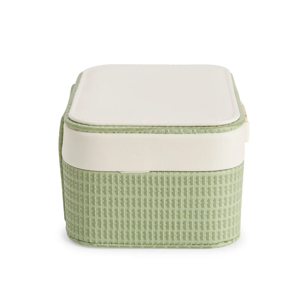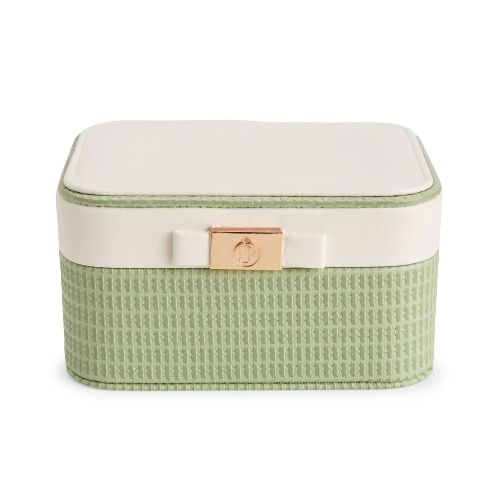 Porta-joias em couro sintético texturizado, com detalhe frontal em metal e revestimento interno em veludo. Possui cinco ganchos e um bolso costurado na parte interna da tampa. Conta ainda com dois compartimentos internos principais: o superior, com divisórias em tamanhos diferentes, incluindo uma repartição almofadada para anéis e brincos; e o inferior com divisória removível.